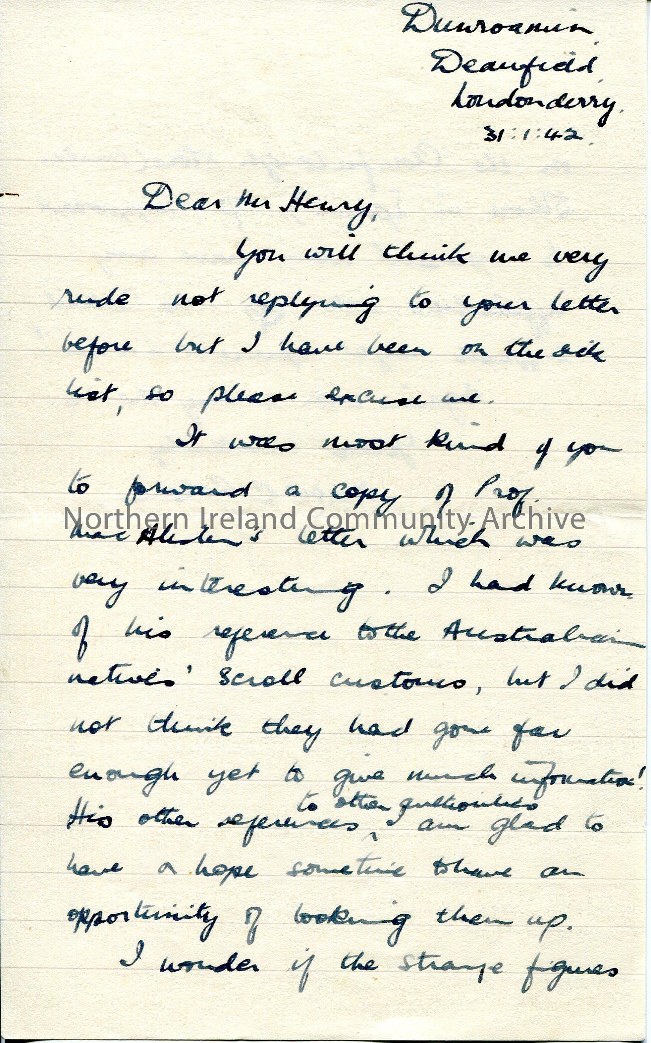 Handwritten letter (double sided) to Sam Henry. Re Australian natives scroll customs and Clonfinlough stone.