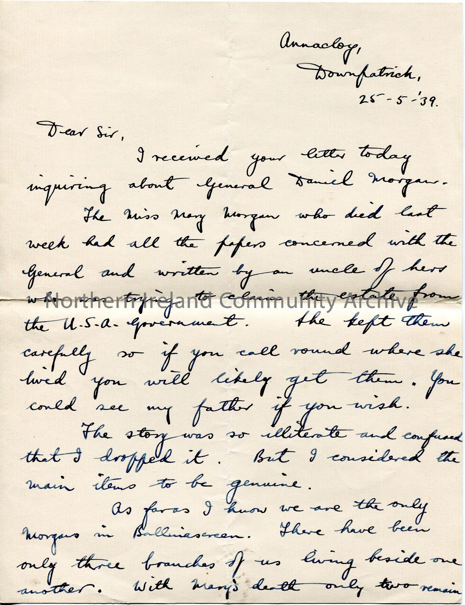 Handwritten letter (double sided) to Sam Henry. Responding to Sam’s query re General Daniel Morgan.