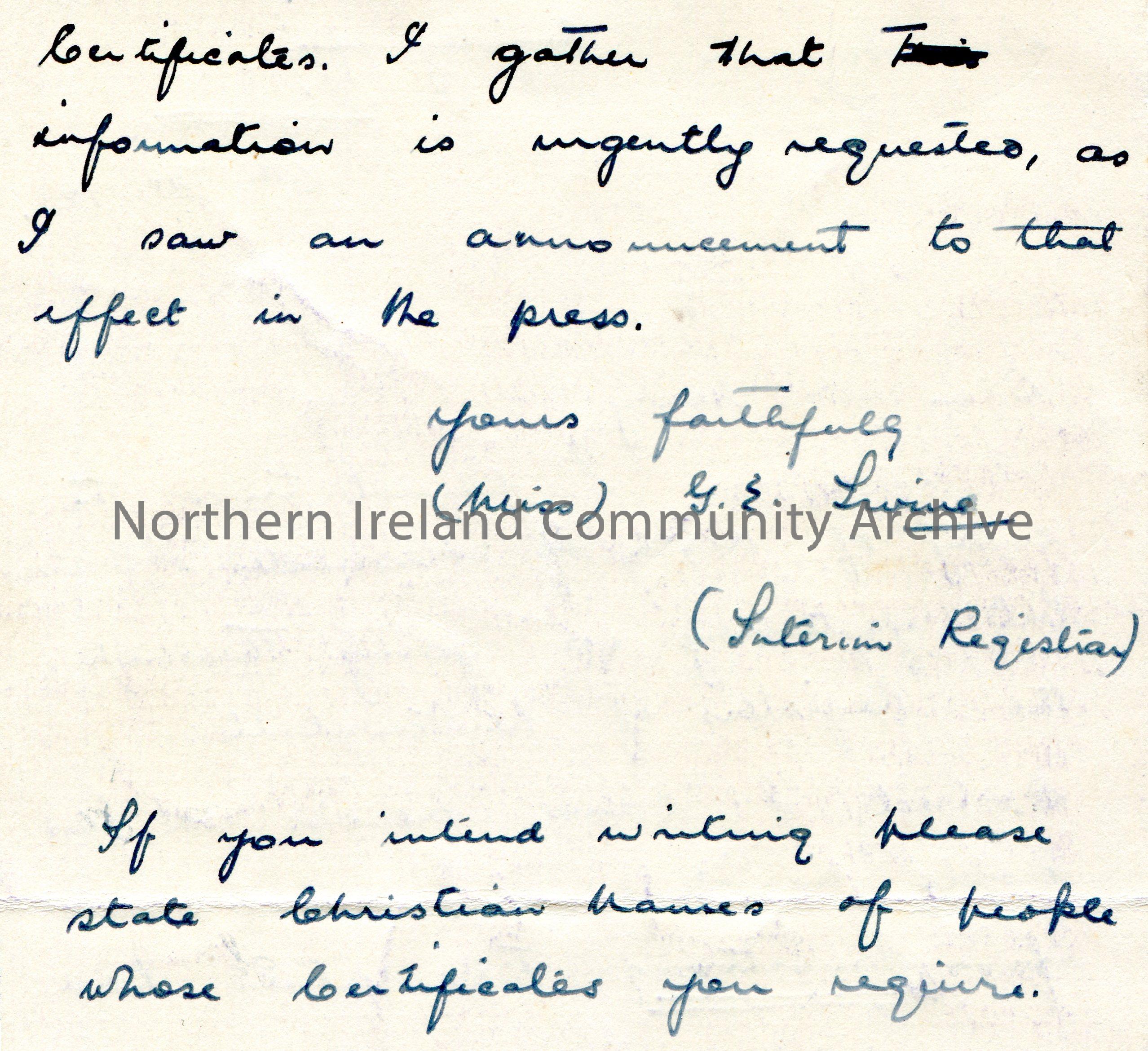 Handwritten letter (double sided) to Sam Henry. Searched the Registers of Newtownbutler for the surname Abraham. Sam is helping James Johnston Abraham… – scan051b