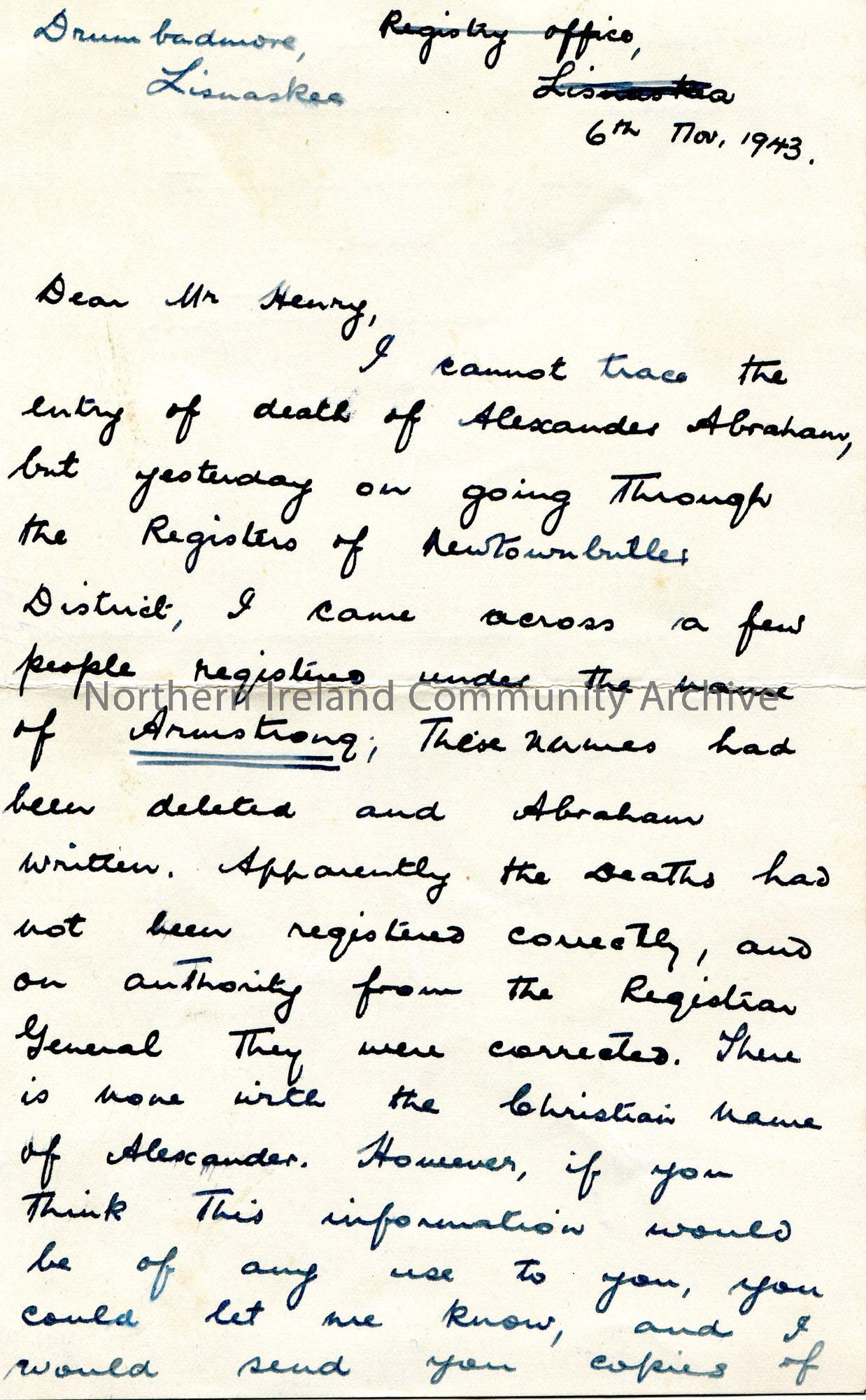 Handwritten letter (double sided) to Sam Henry. Searched the Registers of Newtownbutler for the surname Abraham. Sam is helping James Johnston Abraham research his family tree.
