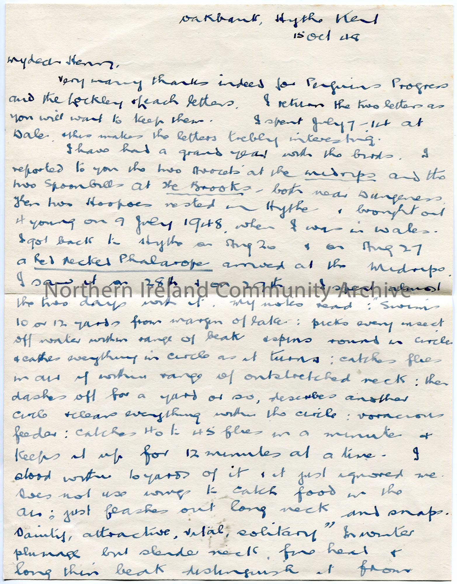 Handwritten letter (double sided) to Sam Henry. Thanks Sam for sending the Lockley and Leach letters. Recounts his observations of birds over the past year. He has been invited to lecture on two occasions. Keen to meet again with Sam once petrol restrictions are over. Writes that he is an 'Ulsterman'.