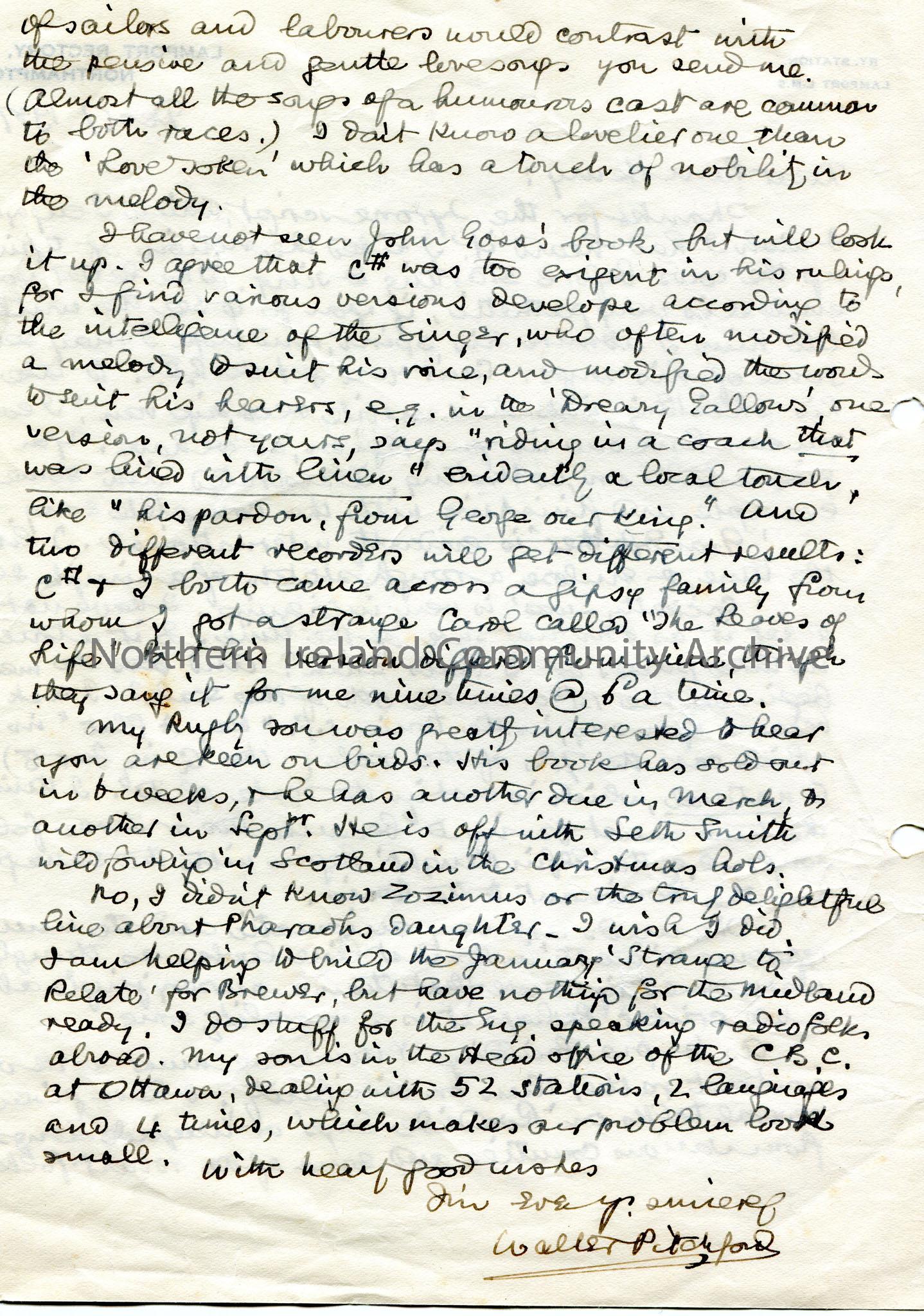 Handwritten letter (double sided) to Sam Henry. Thanks Sam for the Tyrone script. Suggests Sam give a talk on collecting. Discusses the melody and timings of various folk songs. Mentions a book by John Goss. Talks of Sam's interest in birds. Mentions Zozimus and that his son works in C.B.C in Ottawa.