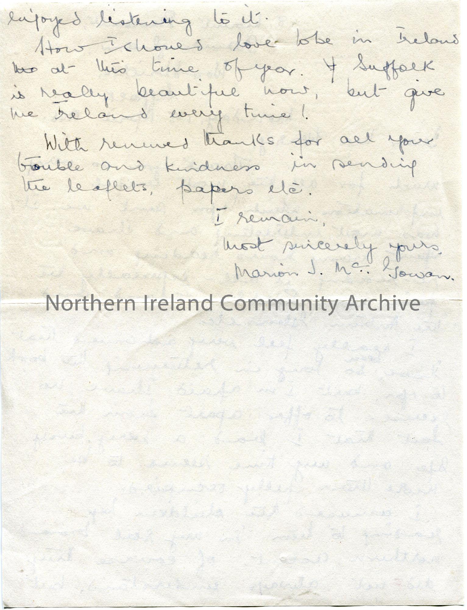 Handwritten letter (double sided) to Sam Henry. Thanks Sam from sending her information re Rathlin Island and the Antrim Glens. Apologises for delay i… – scan078b