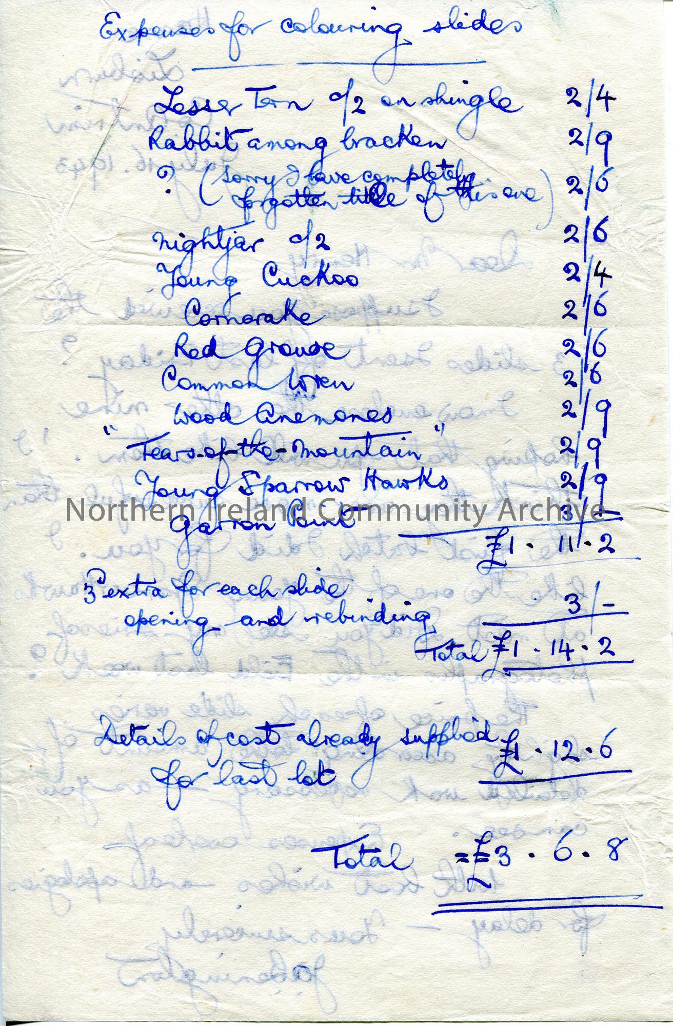 Handwritten letter (double sided) to Sam Henry. They have coloured slides for Sam and provide a list of expenses on the reverse of the letter totallin… – scan031b