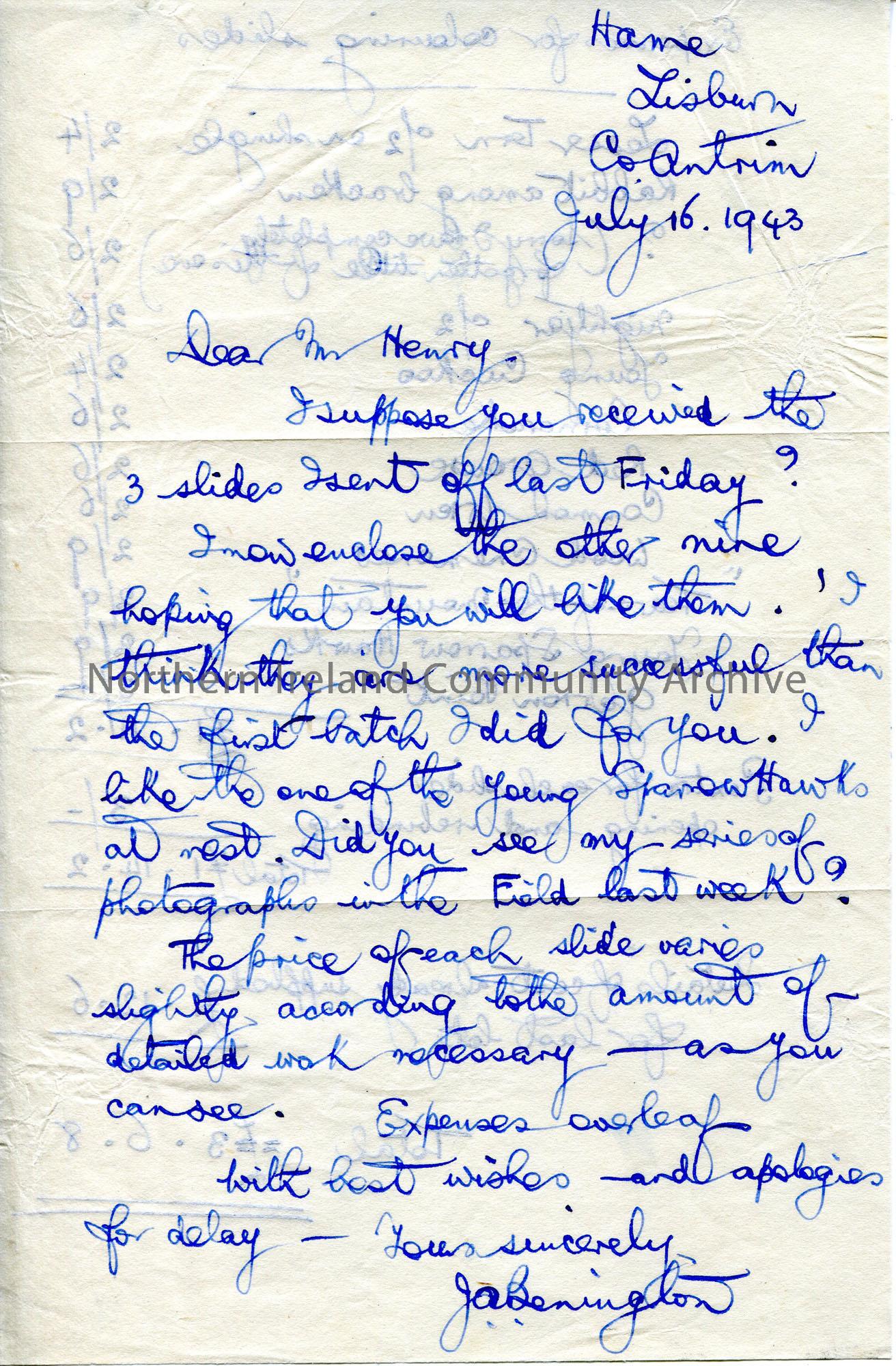 Handwritten letter (double sided) to Sam Henry. They have coloured slides for Sam and provide a list of expenses on the reverse of the letter totalling £3.6.8. They had a series of photographs published in the 'Field'.