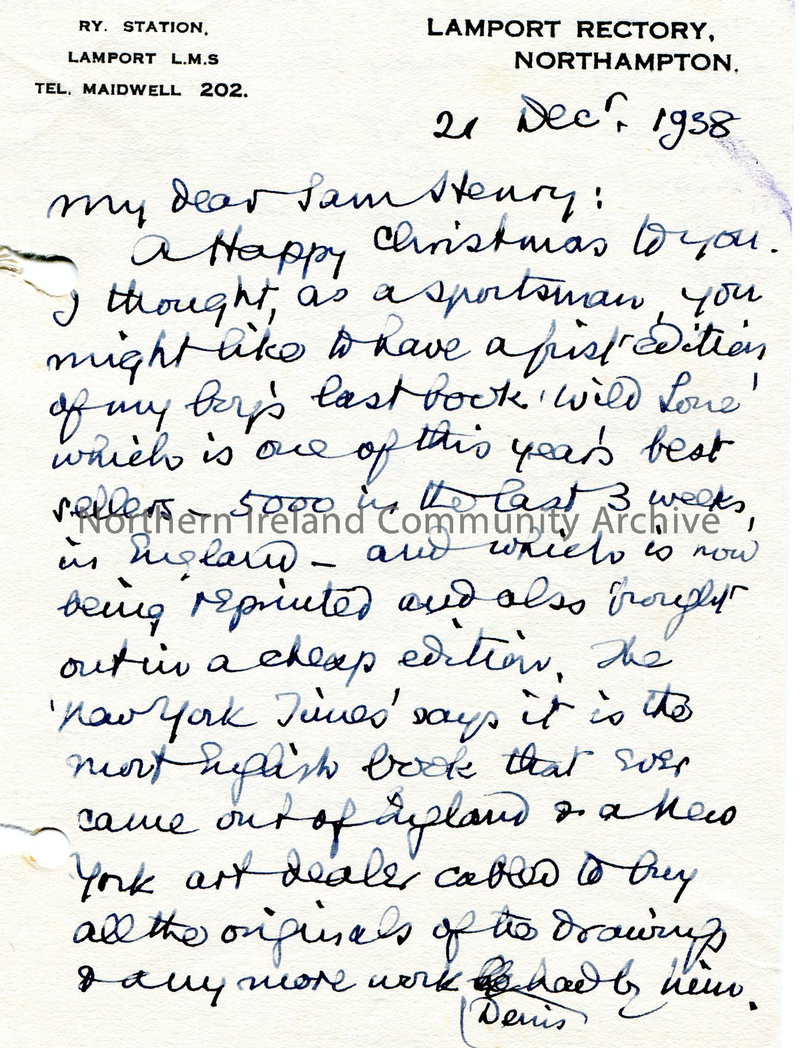 Handwritten letter (double sided) to Sam Henry. Wishes Sam a Happy Christmas. Thinks Sam would like a first edition copy of his son’s [Denis Watkins P…
