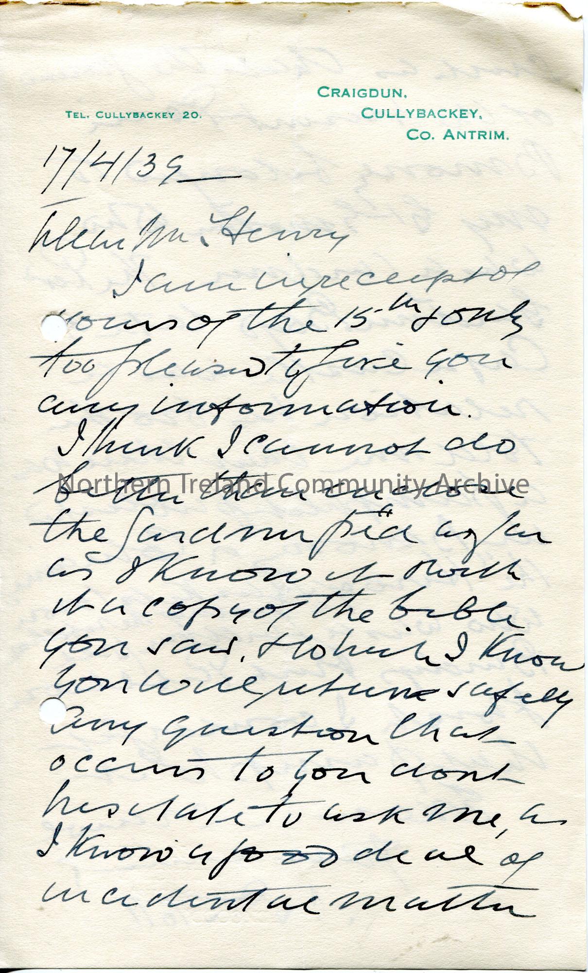 Handwritten letter (double sided) to Sam Henry. Writes about Sam returning a Bible, the post office in Ballymoney, a pamphlet published in Ballymoney …