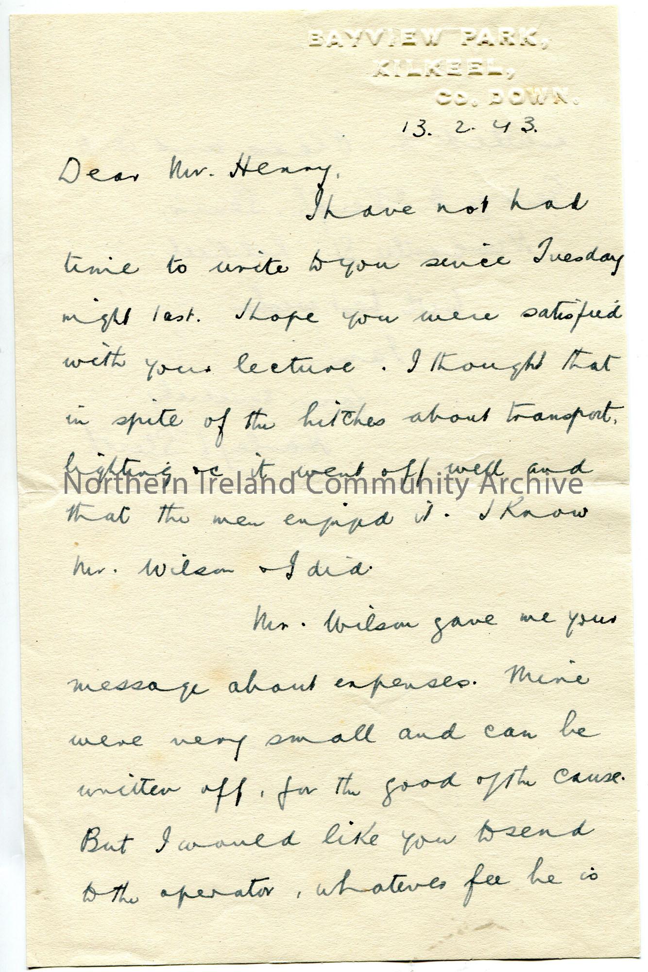 Handwritten letter (double sided) to Sam Henry. Writes of a recent lecture by Sam. Tells Sam that the men, Mr Wilson and themselves enjoyed it. Asks Sam to send fee to the lantern operator to George McVeigh, Senior, Newcastle Street, Kilkeel.