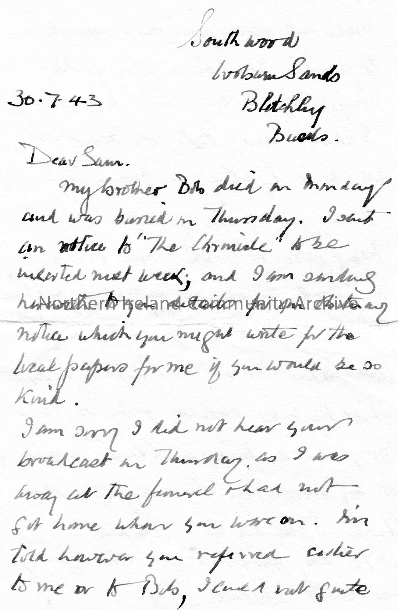 Handwritten letter (double sided) to Sam Henry. Writes of his brother's death. Asks Sam to write an obituary for him for the papers. Missed Sam's broadcast on Thursday in which he referred to either James or his brother. Asks Sam to check the Clones Register of his great grandfather Alex Abraham in his research of his family tree.