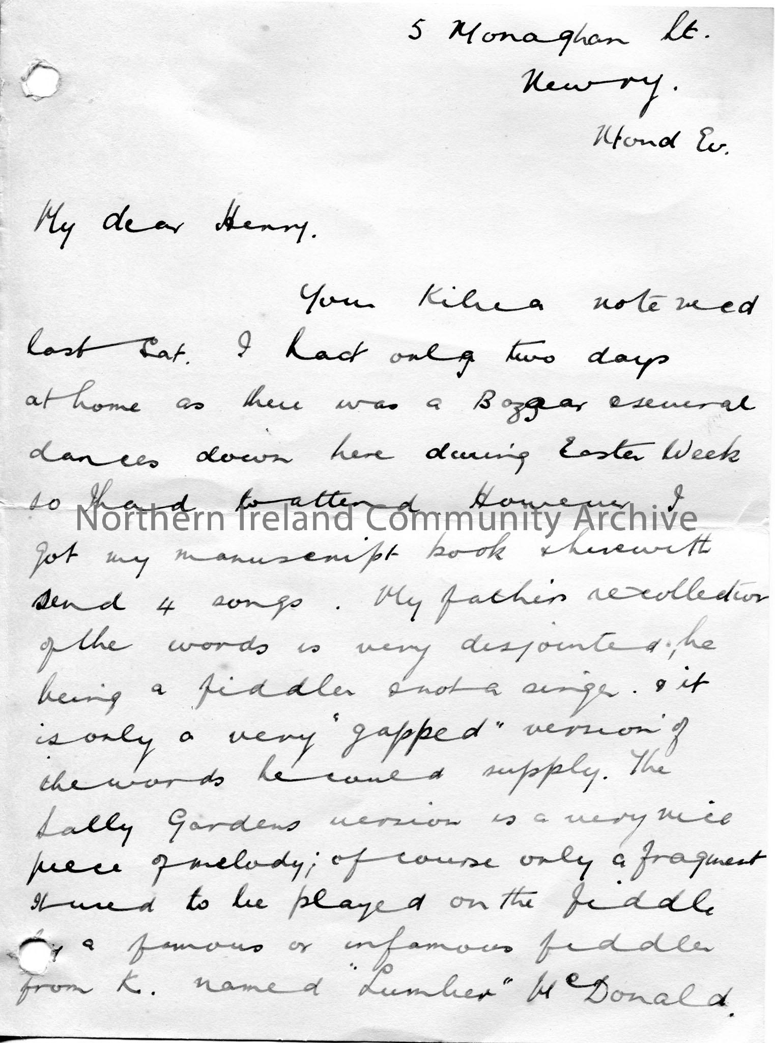 Handwritten letter, double sided, to Sam Henry. Writes of his father being a fiddler. Refers to the song Sally Gardens and how it was played and sang by a fiddler named 'Lumber' McDonald. Refers to the songs 'The Beggar Man' and 'The Galier? Lunzie? Man' and that their theme is similar. Writes that he does not have much time but hoped to pick up more songs around Kilrea in the Summer. Encloses 4 songs.