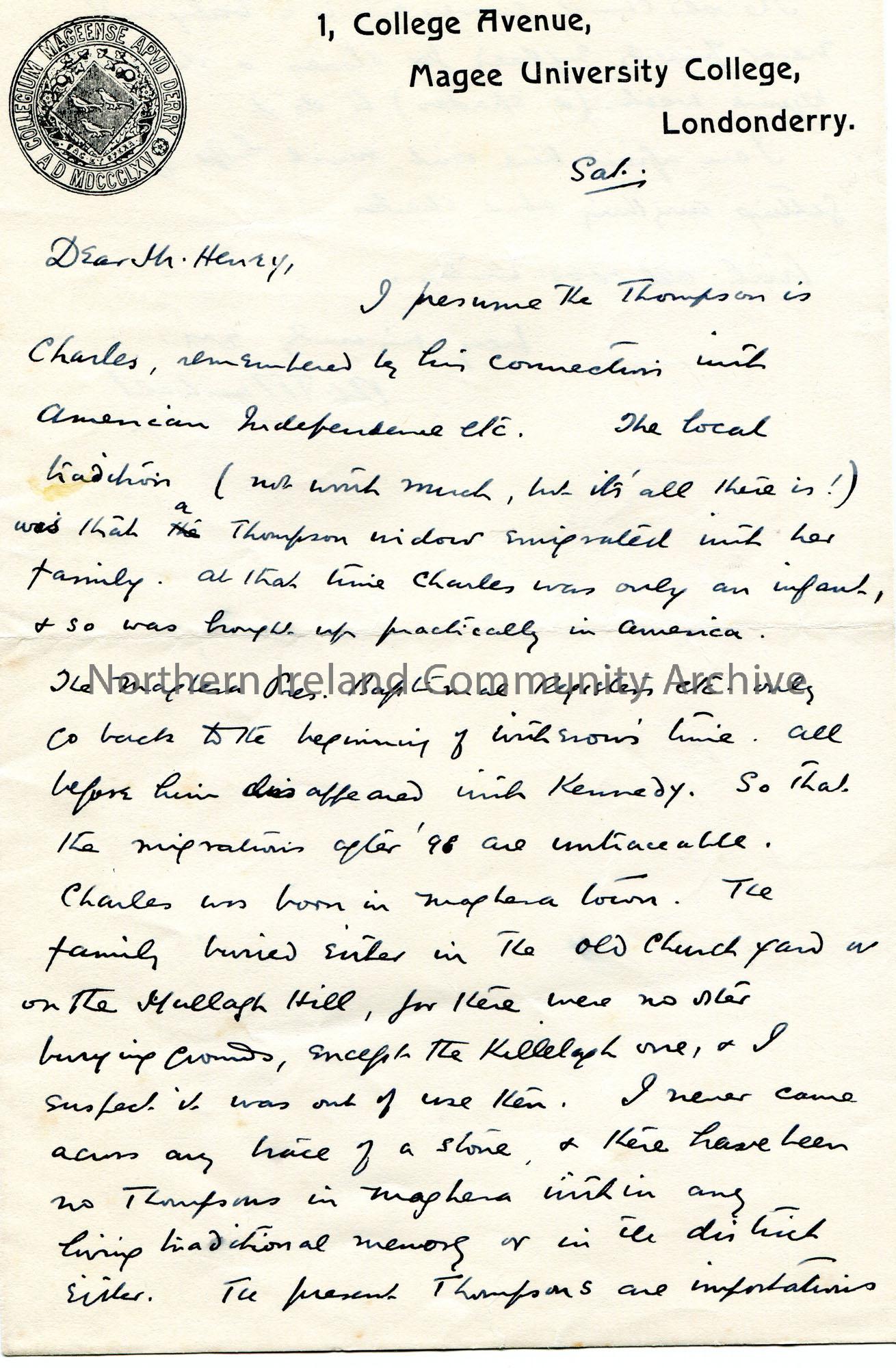 Handwritten letter (double sided) to Sam Henry. Writing in their assistance to Sam in his search to locate the burial place of Charles Thomson's mother.