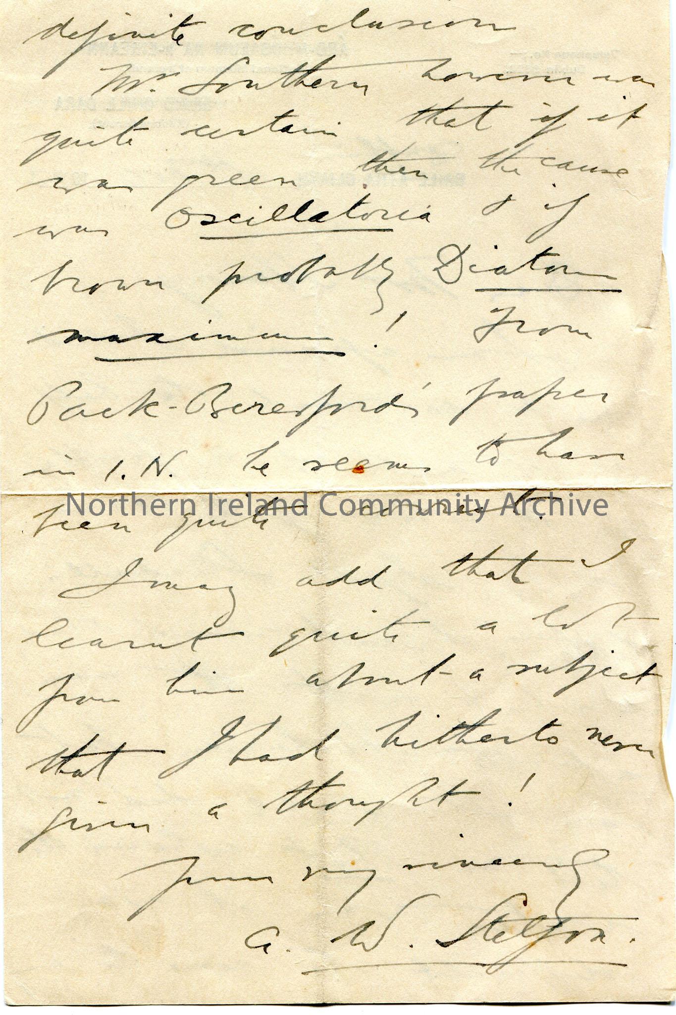Handwritten letter (double sided) to Sam Henry. Writing re a problem of the colour of the water of the Bann. – scan100b