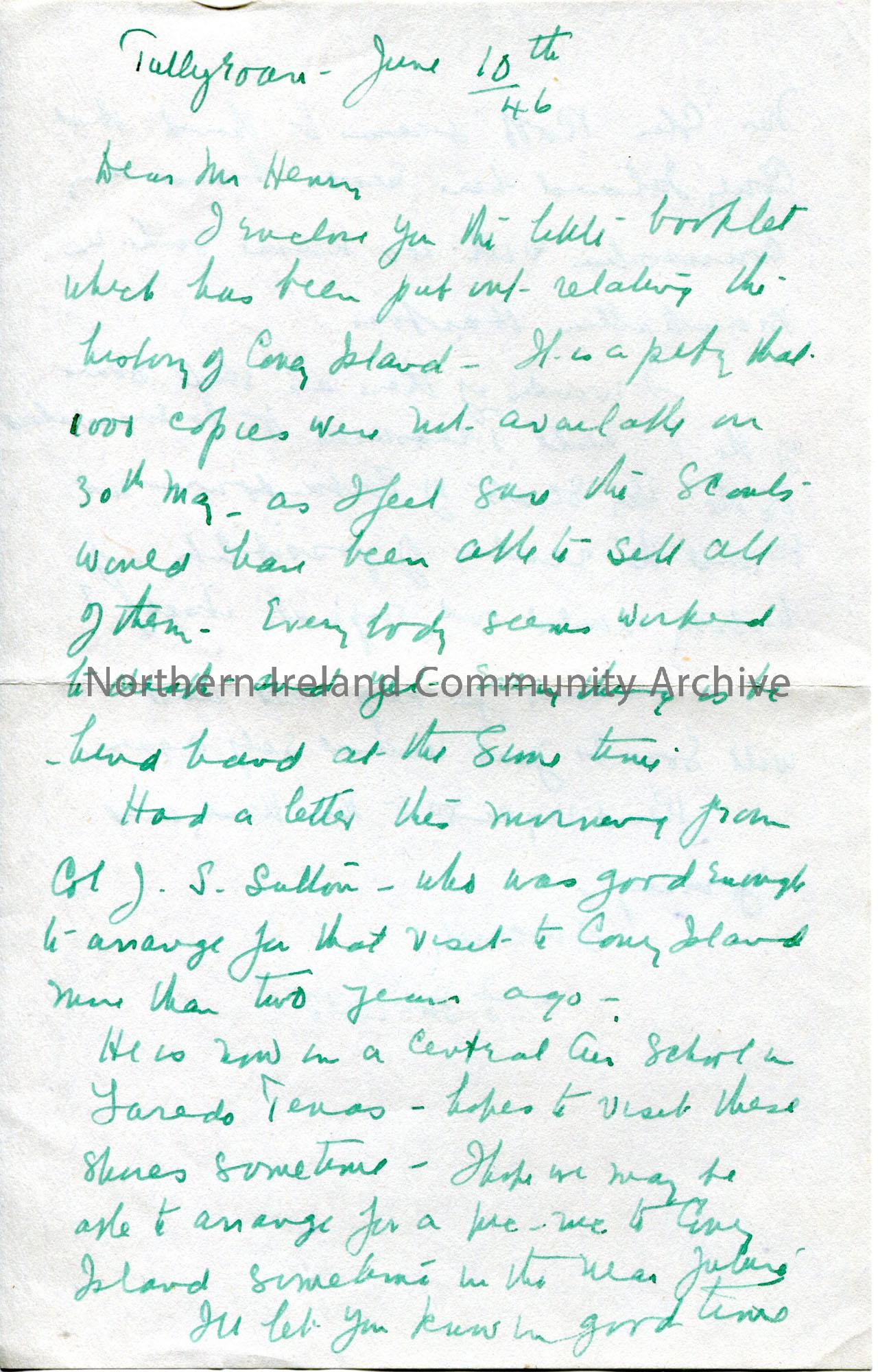 Handwritten letter (double sided) to Sam Henry. Writing re Coney Island, Lough Neagh.