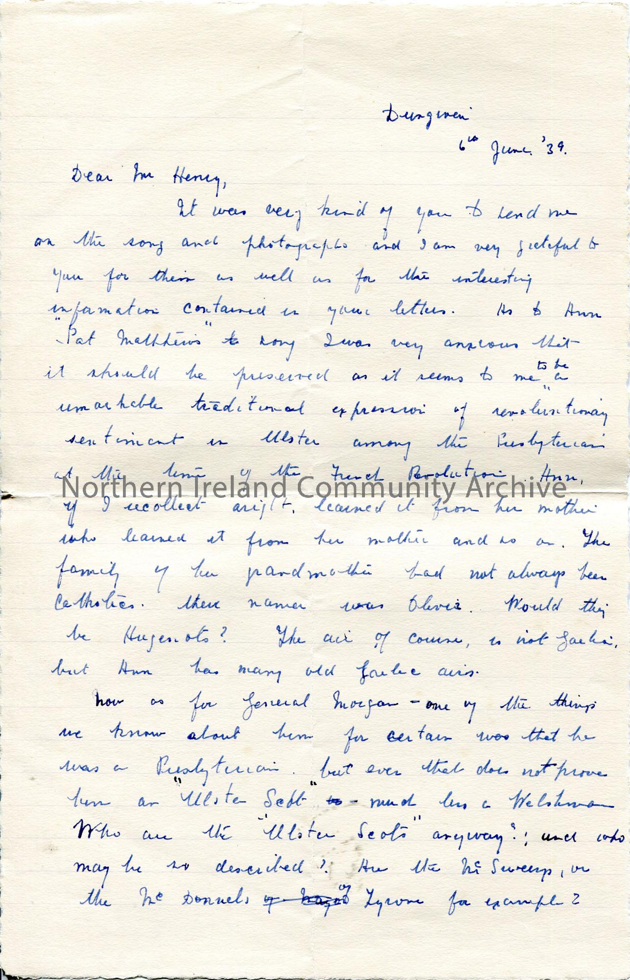 Handwritten letter (double sided) to Sam Henry. Writing re origin of Pat Matthews song. Also writes of General [Daniel] Morgan of America and weather he was a Presbyterian and Ulster Scot.