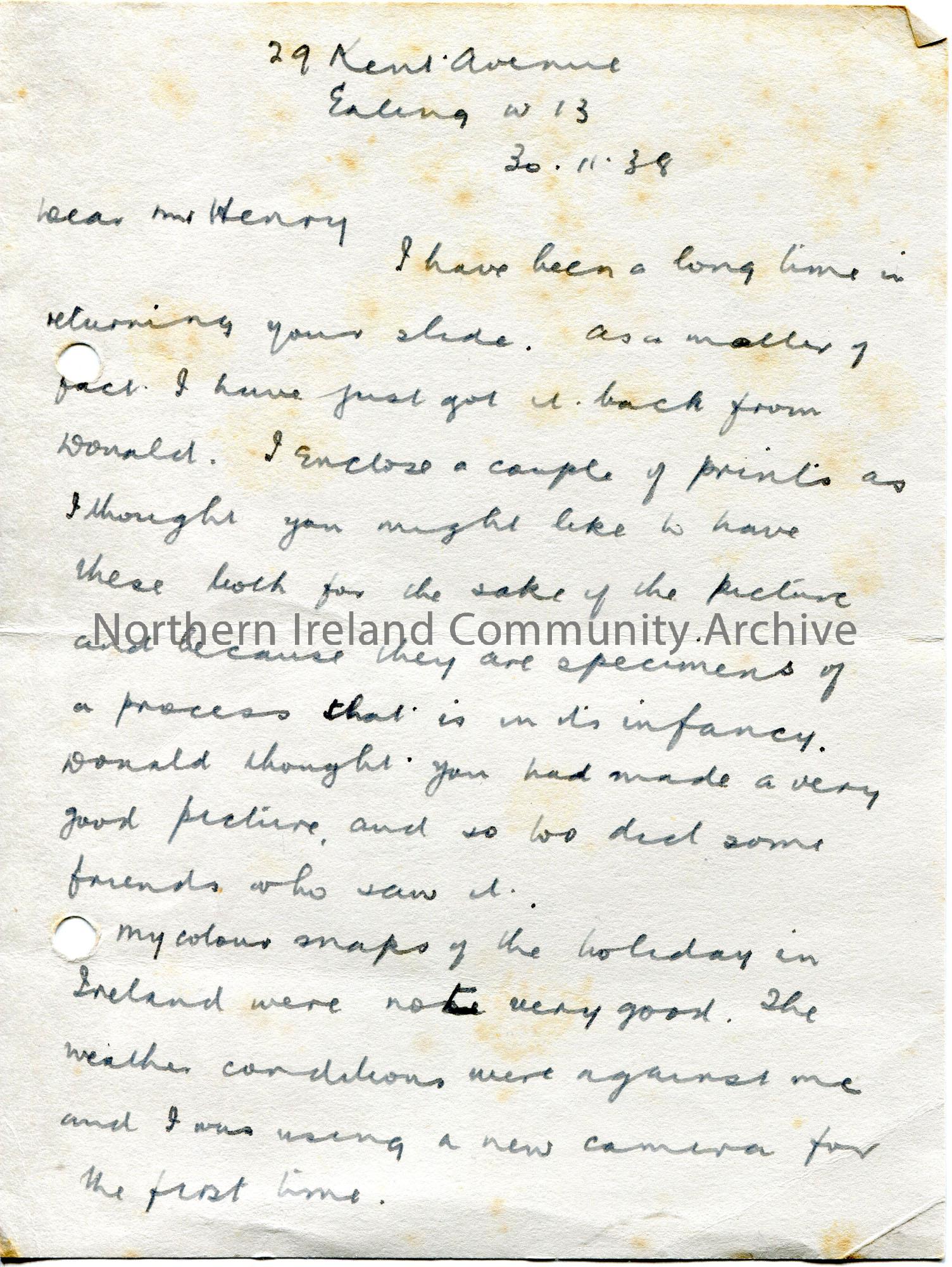 Handwritten letter (double sided) to Sam Henry. Writing re photography. Returns a slide Sam had lent them. Tells Sam they used a new camera whilst holidaying in Ireland but the colour photographs did not turn out well. They did a talk and his wife sang songs at their 'Circle' whilst on holiday. Recommends a visit to a museum in Dublin.