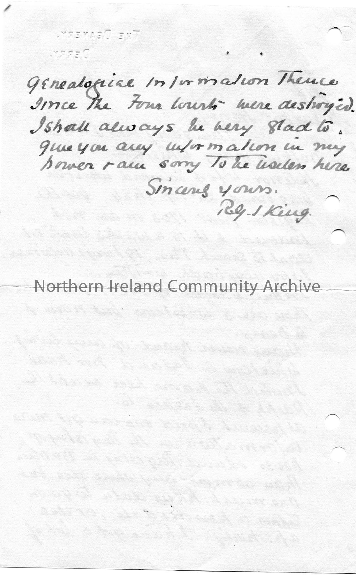 Handwritten letter (double sided) to Sam Henry. Writing re Sam’s enquiry of Whistler genealogy. Informs Sam he has no information to give him. ‘Pedigree ? Edward bap Facombe youngest bro 16/2/1645.6’ handwritten in pencil at top of letter at front. Top part of letter scored out with pencil.