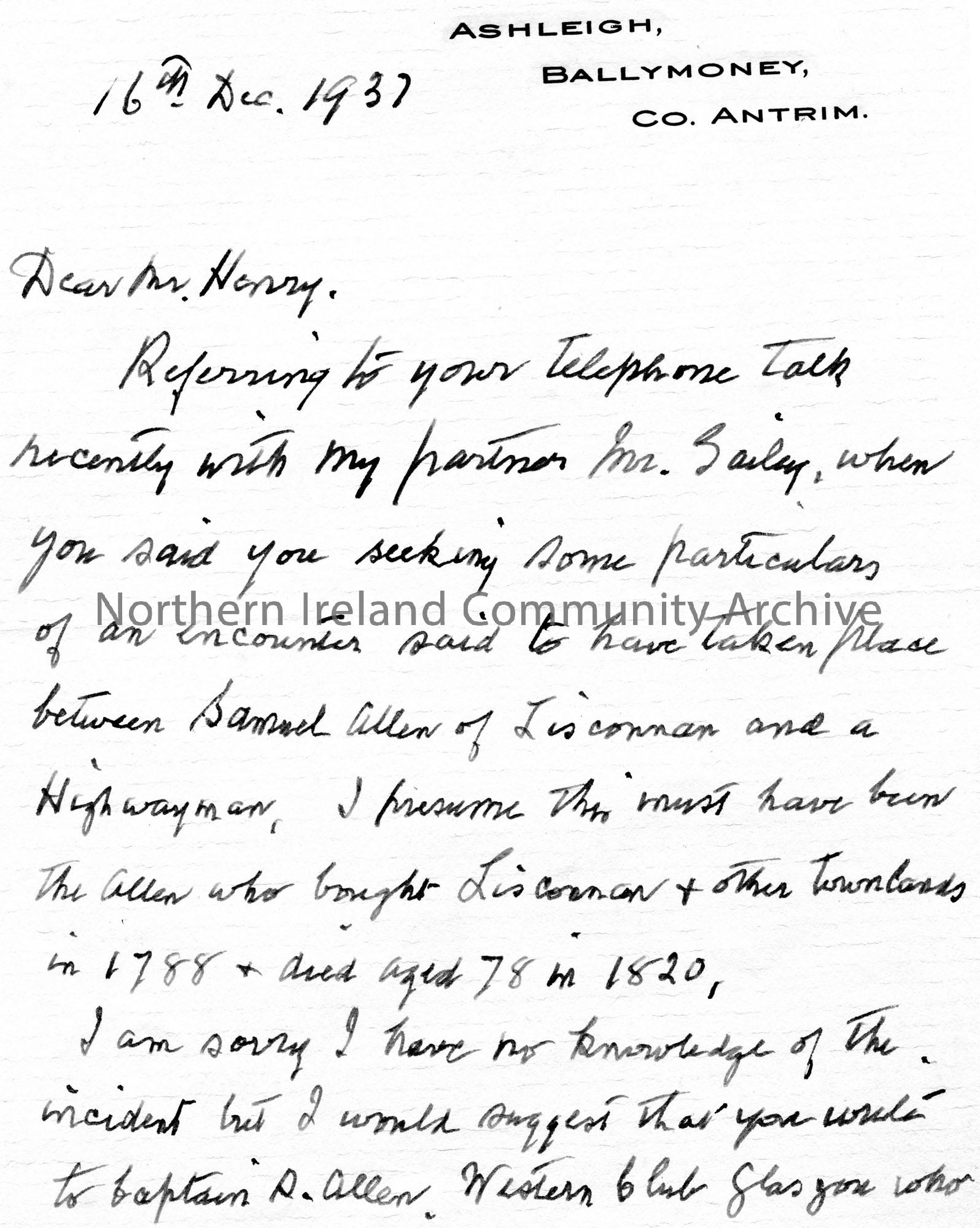 Handwritten letter (double sided) to Sam Henry. Writing re Sam's enquiry of an encounter between a Highwayman and Samuel Allen of Lisconnan. Suggests Sam contact Captain R Allen, Glasgow for information. Asks Sam for help in determining the origin of the place name Boheshane.