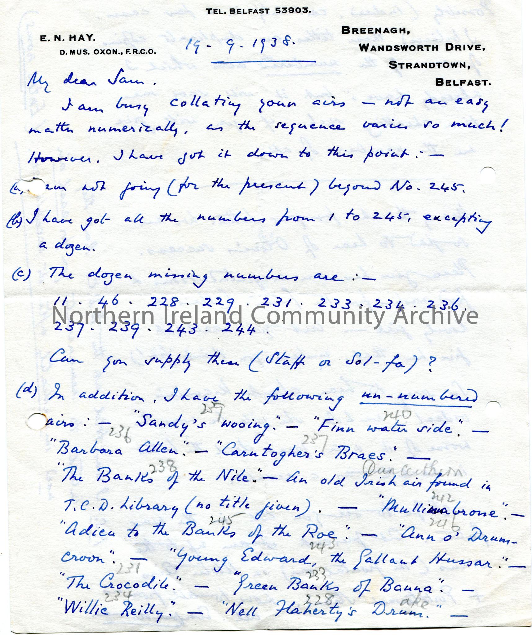 Handwritten letter (double sided) to Sam Henry. Writing re the songs Sam has supplied him with. Writes that he is glad to hear of Olive’s success and …