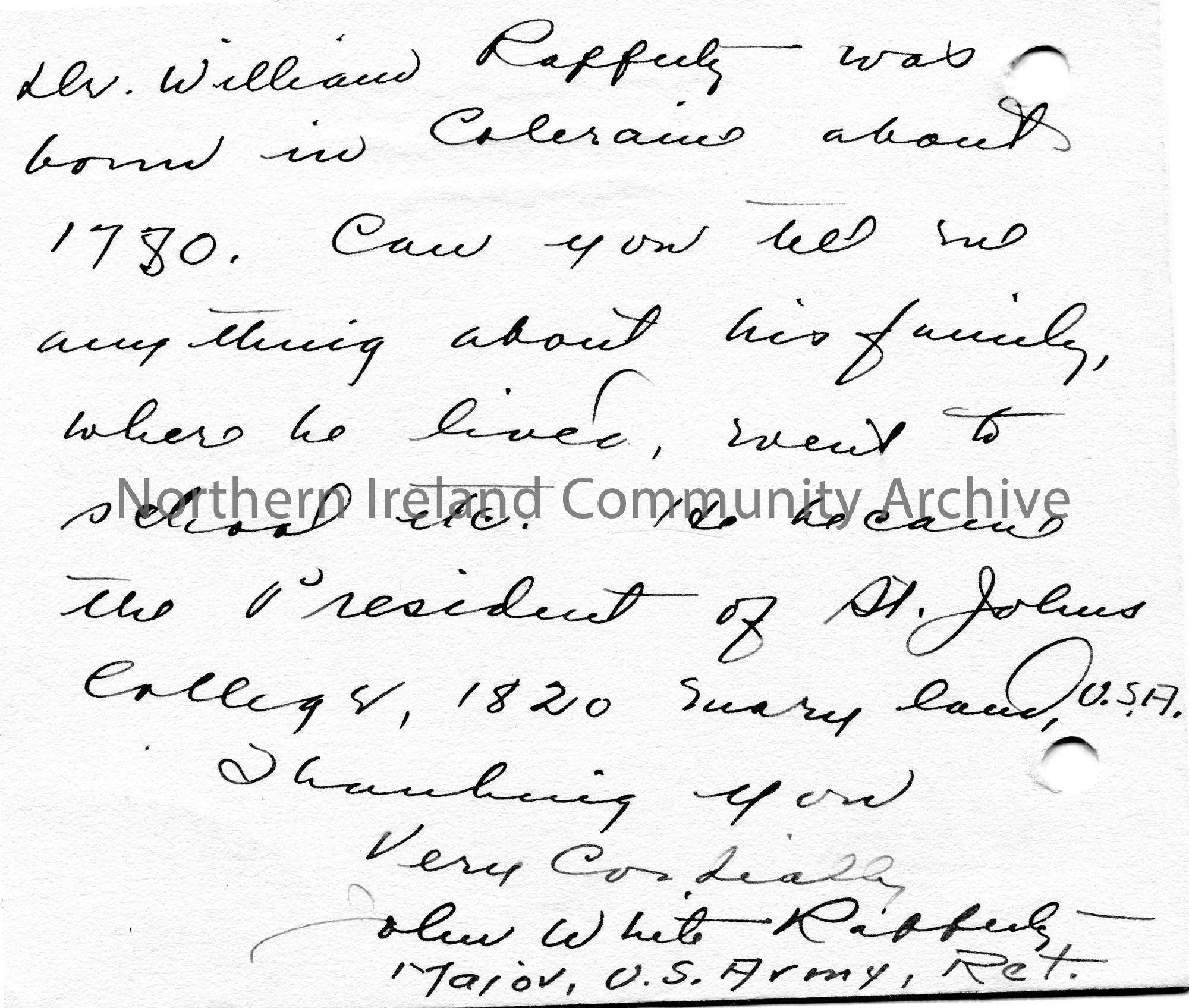 Handwritten letter (double sided) to The Mayor, Coleraine, Co. Antrim, Ireland. Asking for genealogical information re their great grandfather, Willia… – scan077b