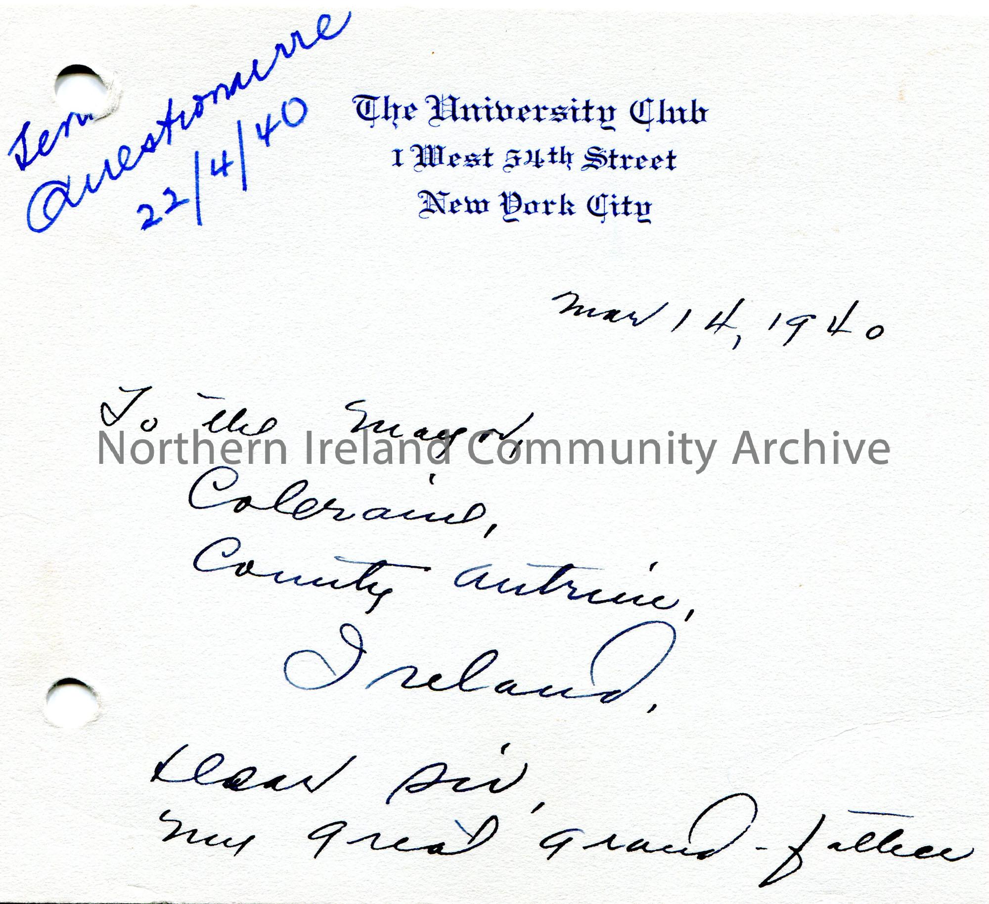 Handwritten letter (double sided) to The Mayor, Coleraine, Co. Antrim, Ireland. Asking for genealogical information re their great grandfather, William Rafferty. 'Sent questionnaire 22/4/40' handwritten at top of page.
