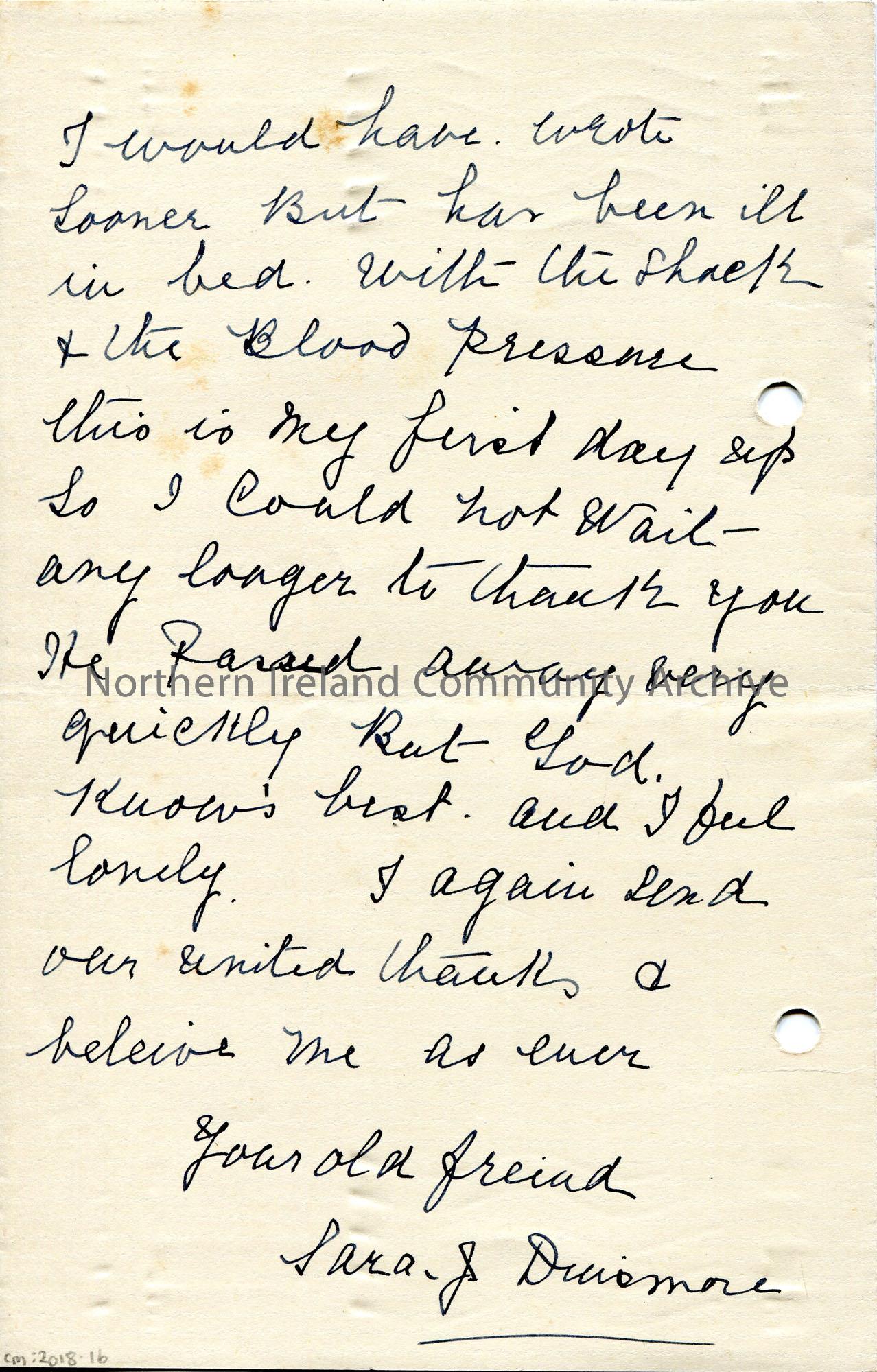 Handwritten letter (double sided) with black border to Sam Henry. Thanking for Sam for writing about her late husband in the Constitution. Mentions Macosquin.