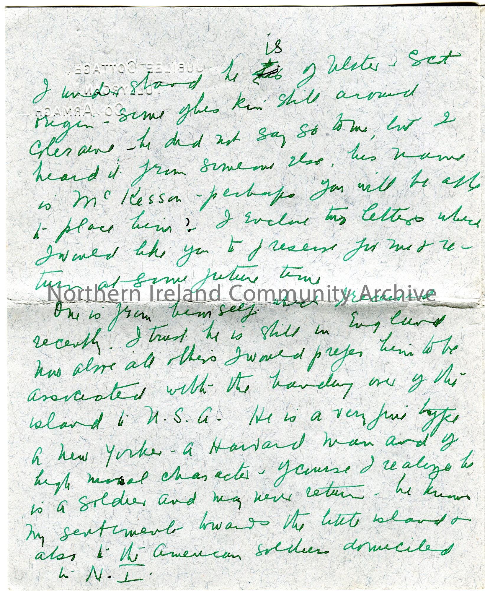 Handwritten letter (folded and written in green ink on 4 sides) to Sam Henry. Writing re the purchase of Coney Island and holds it in high regard. Thinks a Mr Kessan, Major, who lives in New York and has Ulster Scots origins would be suitable to be associated with the handing over of the island to the U.S.A.