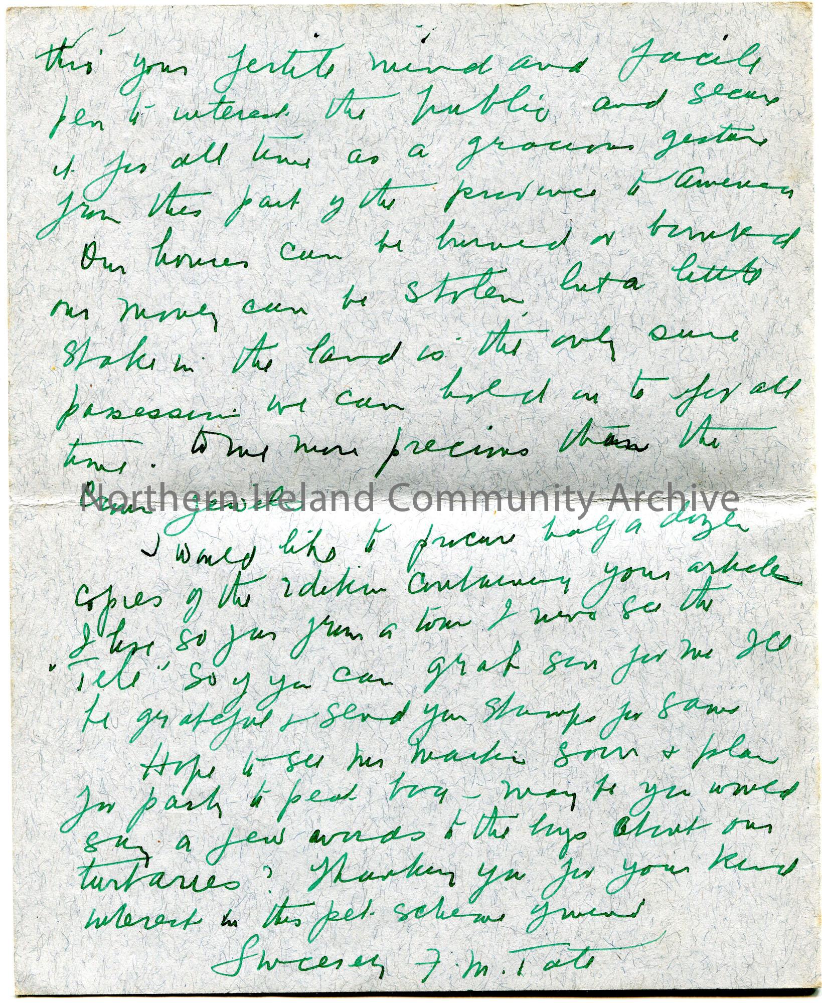 Handwritten letter (folded and written in green ink on 4 sides) to Sam Henry. Writing re the purchase of Coney Island and holds it in high regard. Thinks a Mr Kessan, Major, who lives in New York and has Ulster Scots origins would be suitable to be associated with the handing over of the island to the U.S.A.