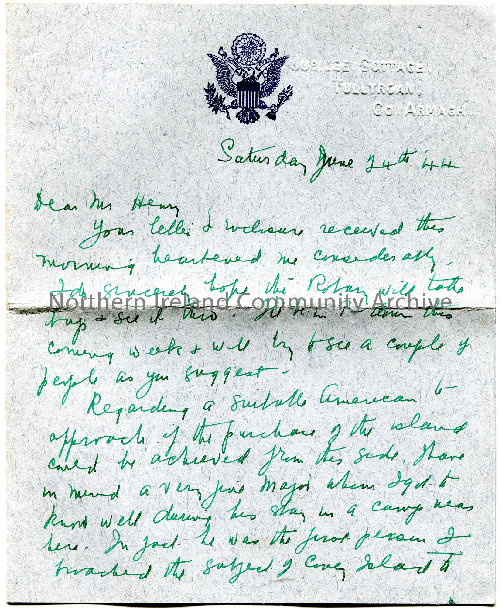 Handwritten letter (folded and written in green ink on 4 sides) to Sam Henry. Writing re the purchase of Coney Island and holds it in high regard. Thinks a Mr Kessan, Major, who lives in New York and has Ulster Scots origins would be suitable to be associated with the handing over of the island to the U.S.A.