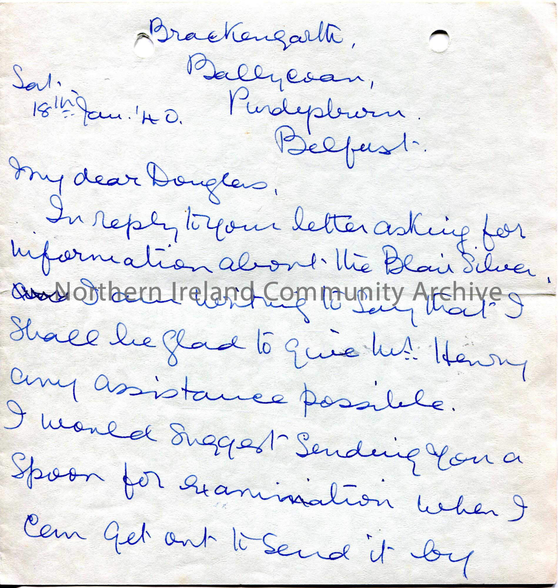 Handwritten letter (folded and written on 2 sides) to ‘My dear Douglas’ [Scott]. Writing re the Blair silver. They would be glad to assist Sam Henry.