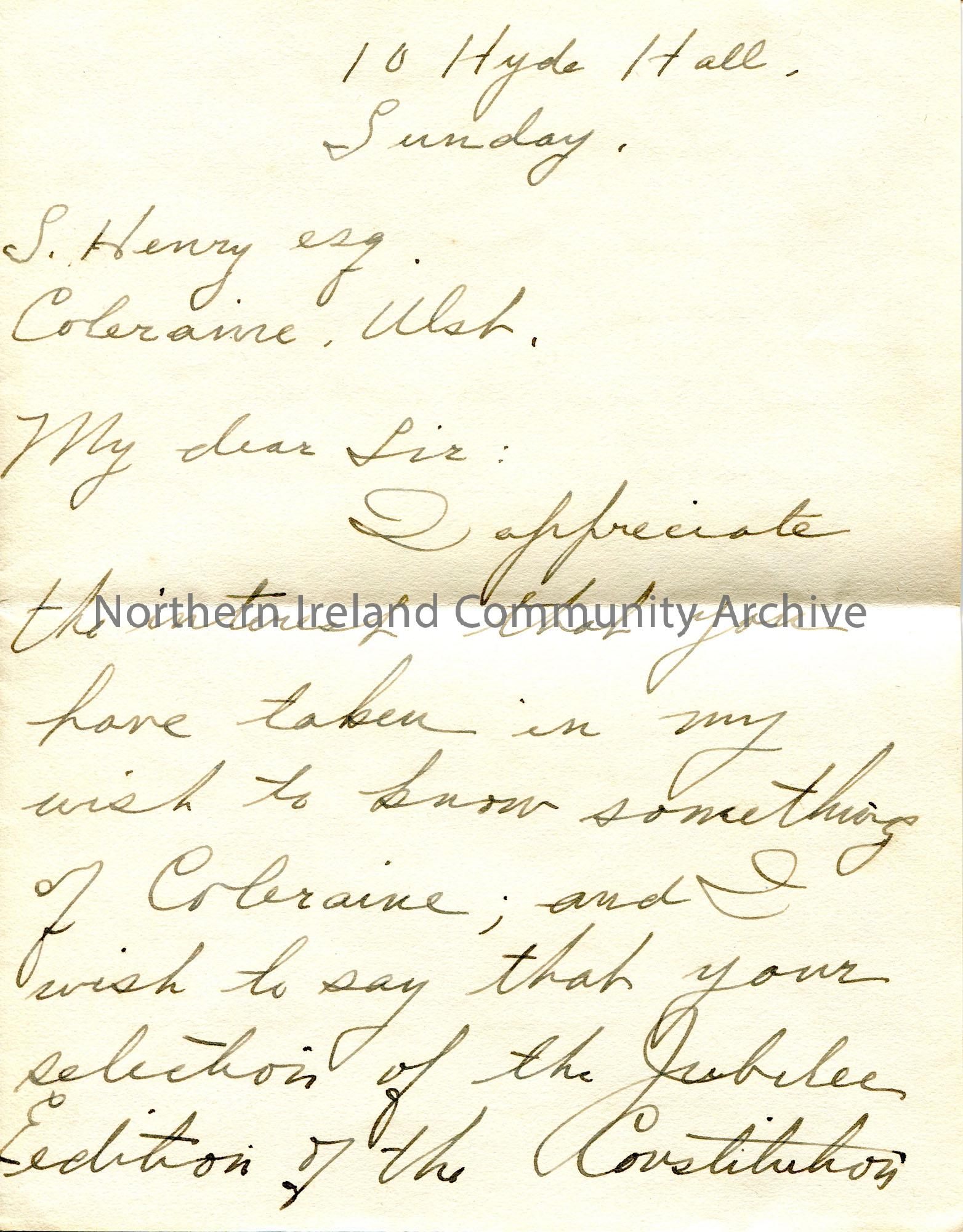 Handwritten letter, folded and written on 3 sides, to Sam Henry. Thanks Sam for sending the Jubilee Edition of the Constitution newspaper as they wished to learn more about Coleraine. Refers to an article re St. Cuthbert.