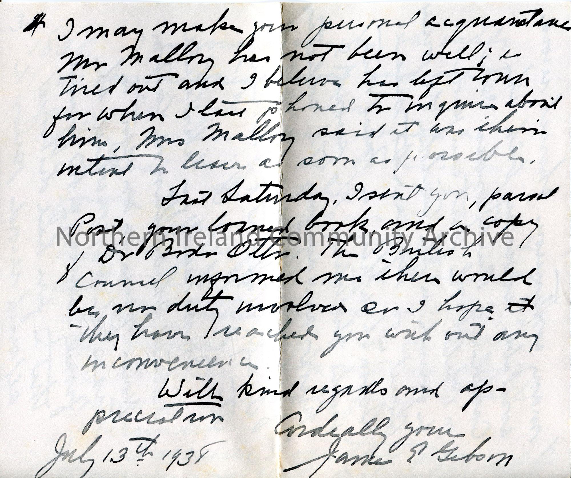 Handwritten letter (folded and written on 4 sides) to Sam Henry from James E Gibson. Sam is helping with genealogy queries. Refers to emigration to Pennsylvania. Returns books to Sam.