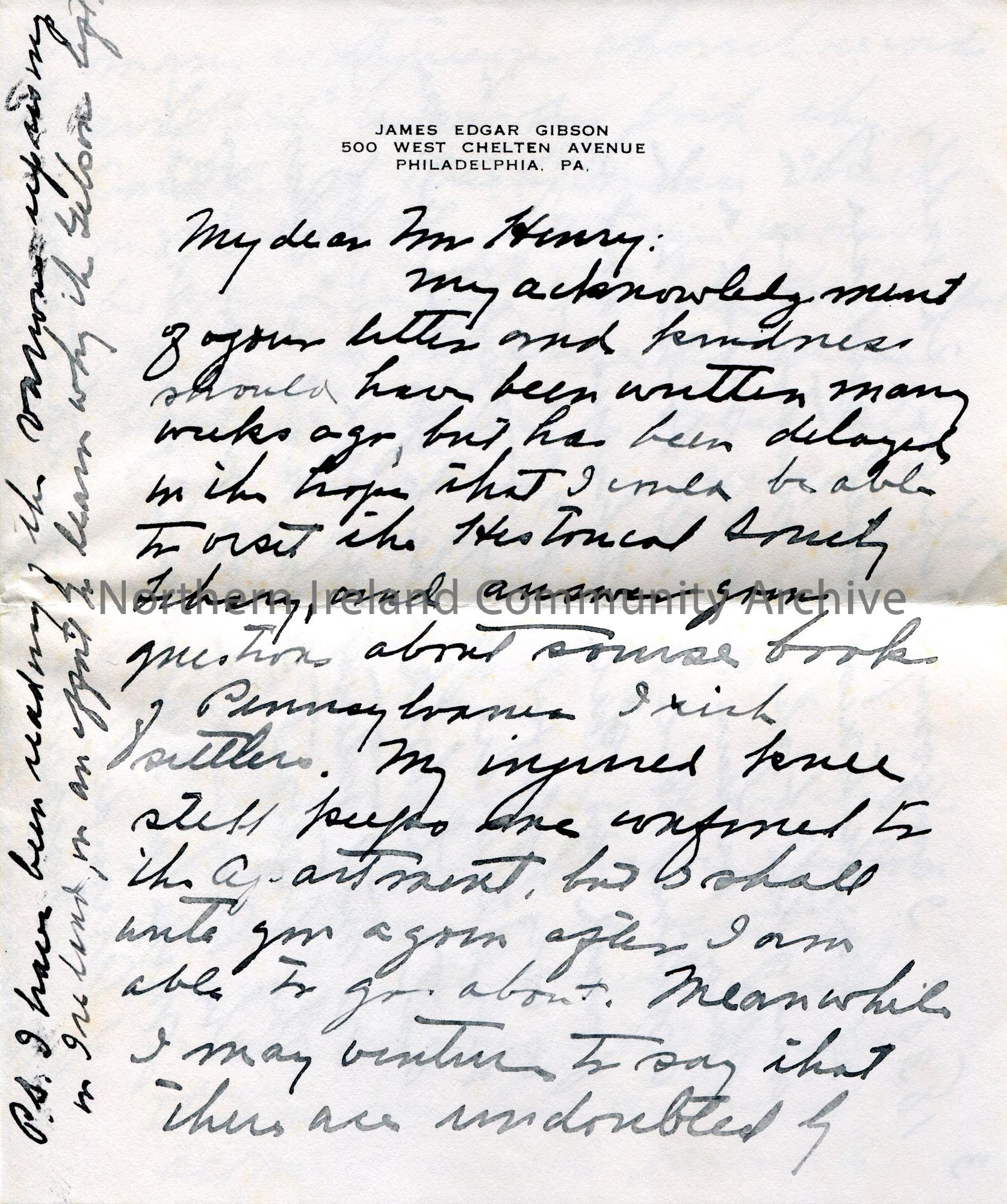 Handwritten letter (folded and written on 4 sides) to Sam Henry from James E Gibson. Sam is helping with genealogy queries. Refers to emigration to Pennsylvania. Returns books to Sam.