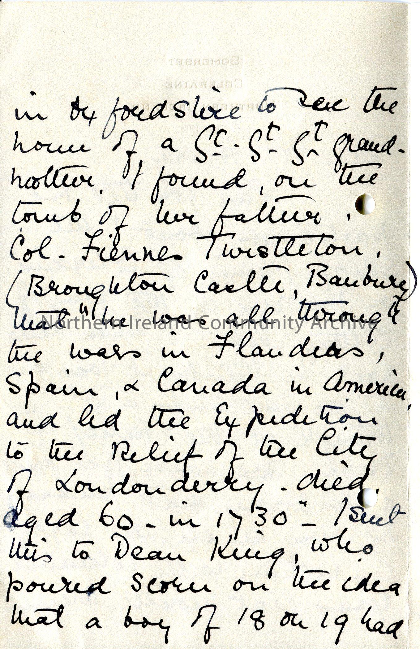Handwritten letter (folded and written on 4 sides) to Sam Henry. Writing re the Phoenix of Coleraine and Col. FiennesTwistleton. She had been corresponding with Dean King on both matters. Asks same for more information on the Phoenix.