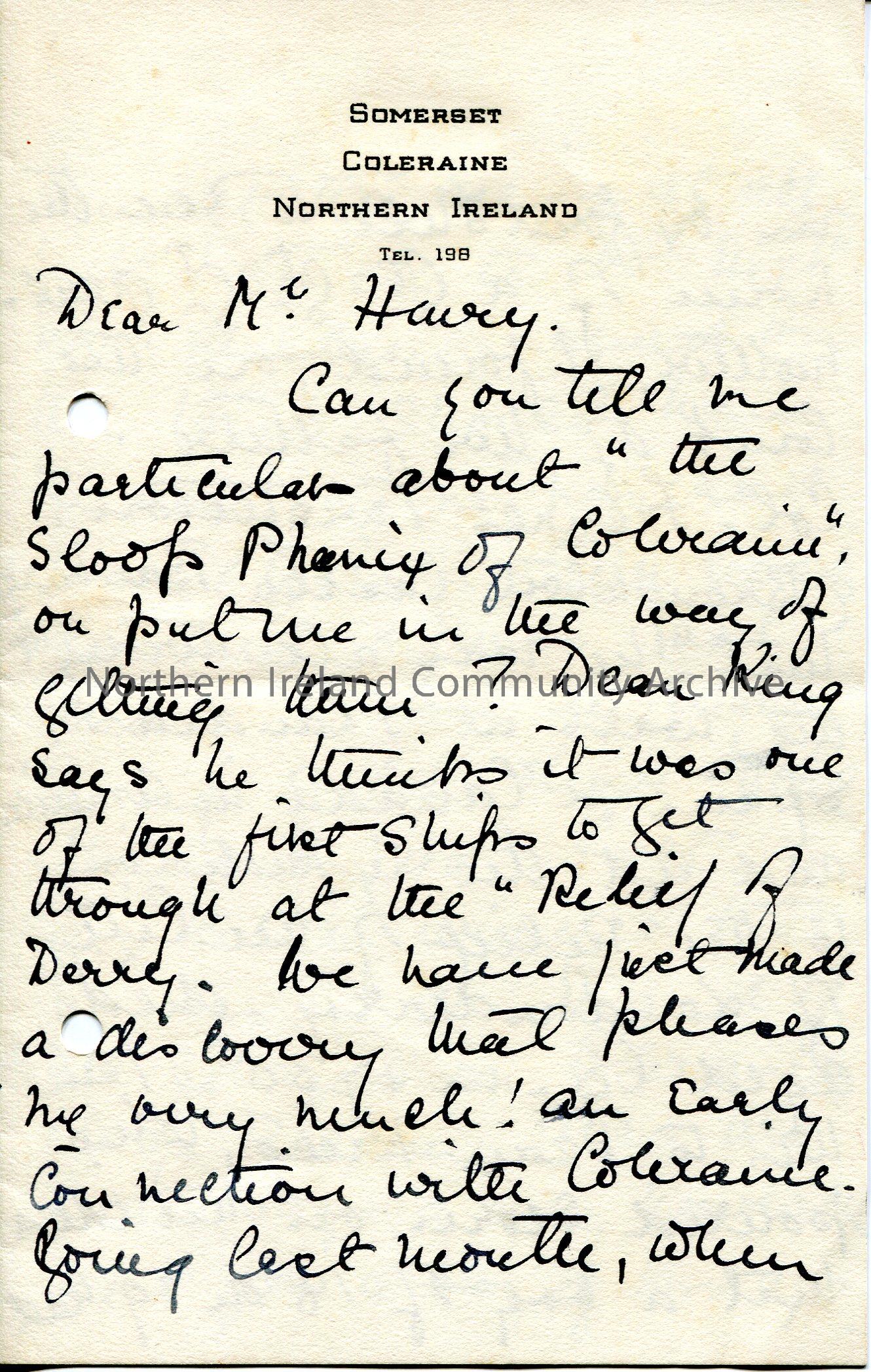 Handwritten letter (folded and written on 4 sides) to Sam Henry. Writing re the Phoenix of Coleraine and Col. FiennesTwistleton. She had been corresponding with Dean King on both matters. Asks same for more information on the Phoenix.