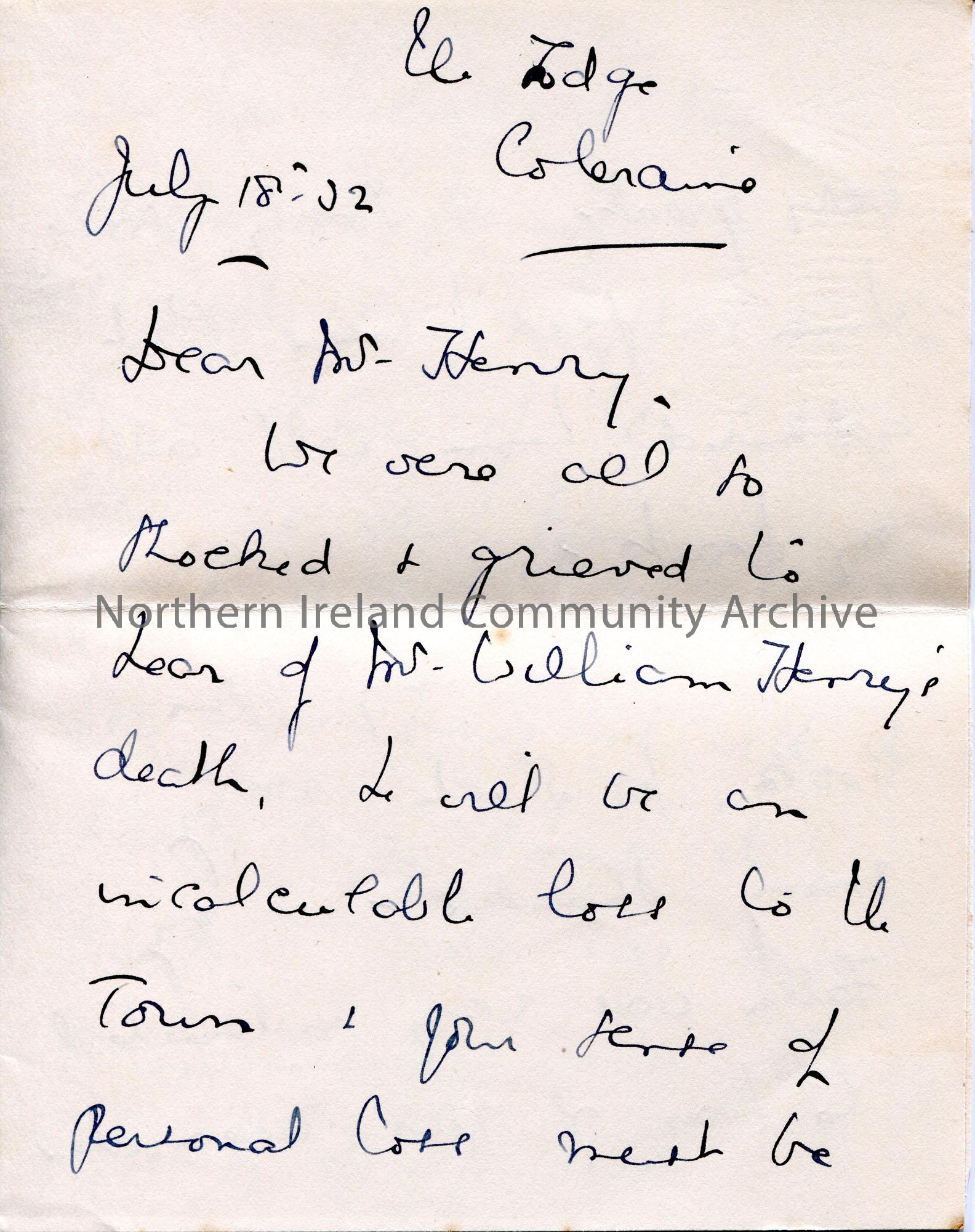 Handwritten letter (folded and written on four sides) to Sam Henry from Dorothea Macausland. Passes on her sympathies on the death of Mr William Henry…
