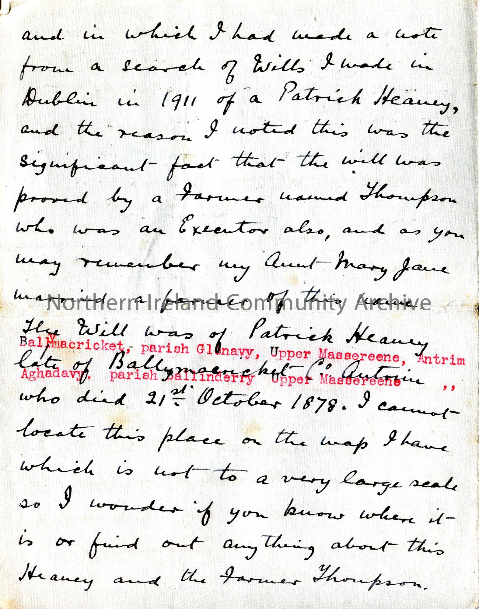 Handwritten letter (folded and written on four sides) to Sam Henry from H Glenn. Writes of unrest in Ireland with the destruction of records in the Four Courts and the impact on genealogy research. Asks Sam if he has any geneaology information re Patrick Heaney and Farmer Thompson who signed his Will.