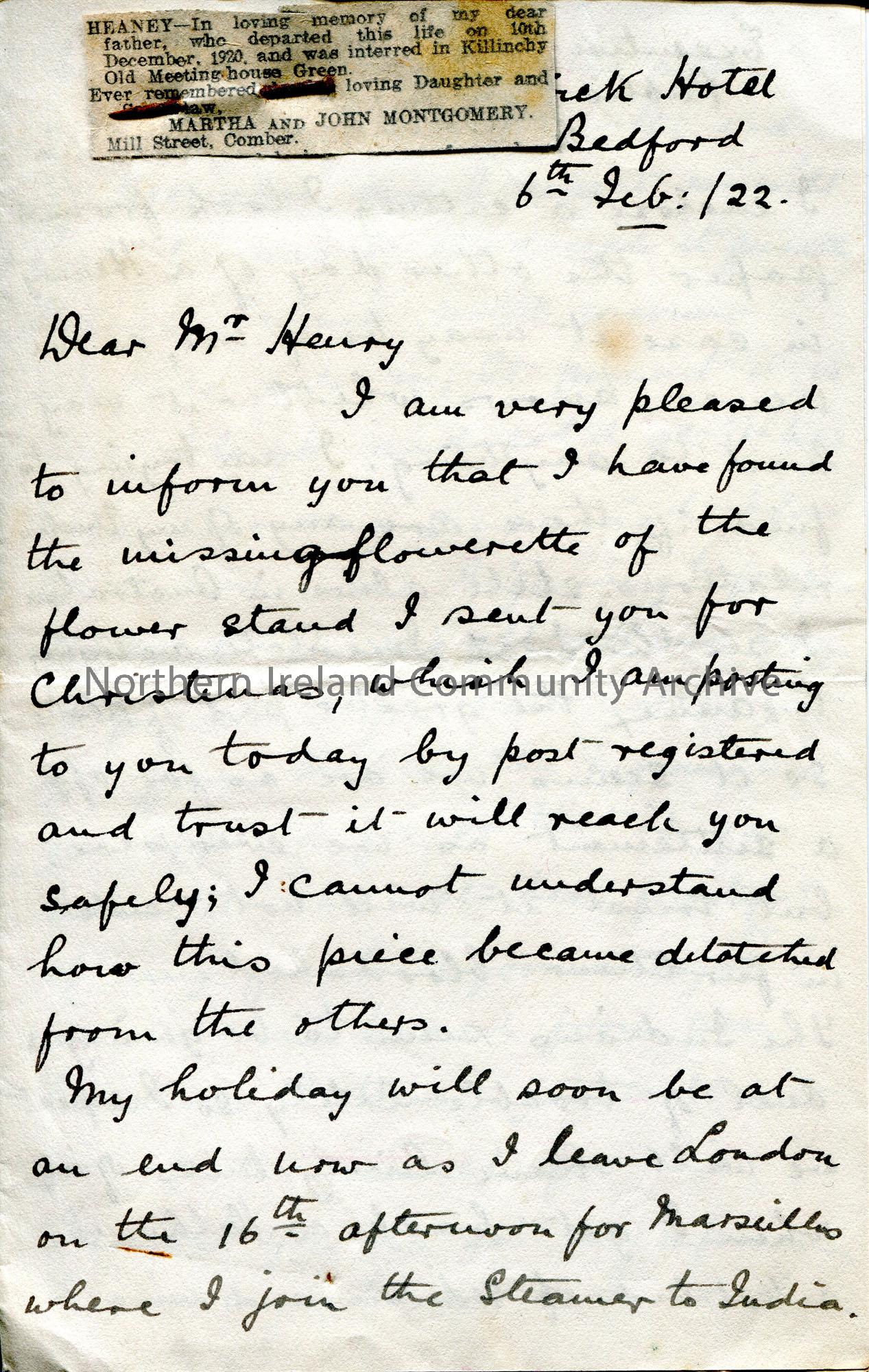 Handwritten letter (folded and written on four sides) to Sam Henry from H Glenn. Writes that they are an Executive Engineer in Delhi, India and will be travelling back there soon. Comments on the political situation in Ireland and unrest in India. Asks Sam how he is getting on with genealogy research. Small newspaper cutting attached to page re memoriam for the name Heaney.