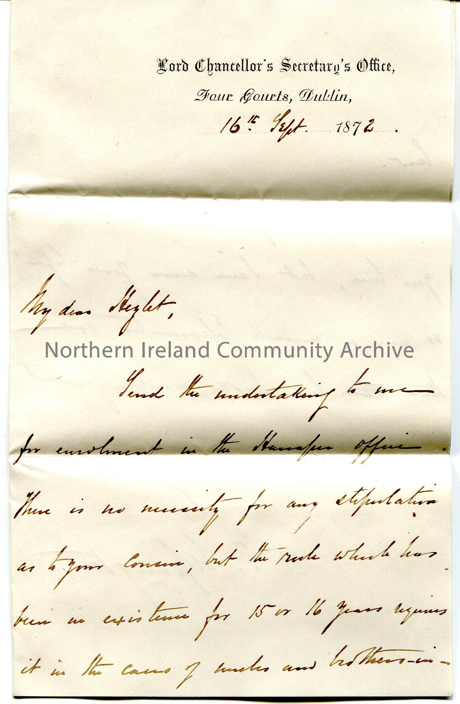 Handwritten letter (folded and written on two of four sides) to ‘My dear Hezlet’ [John]. The receipient is to forward the ‘undertaking’ to them for ‘e…
