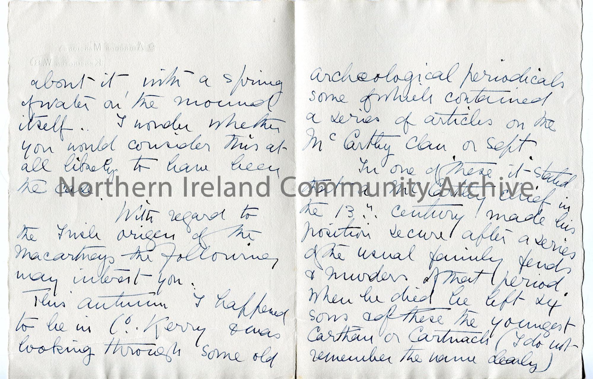 Handwritten letter folded in 2 and using all sides. Relates to McCartneys and Lissanoure Castle – origin of name and Irish and Scottish descent of the… – img579