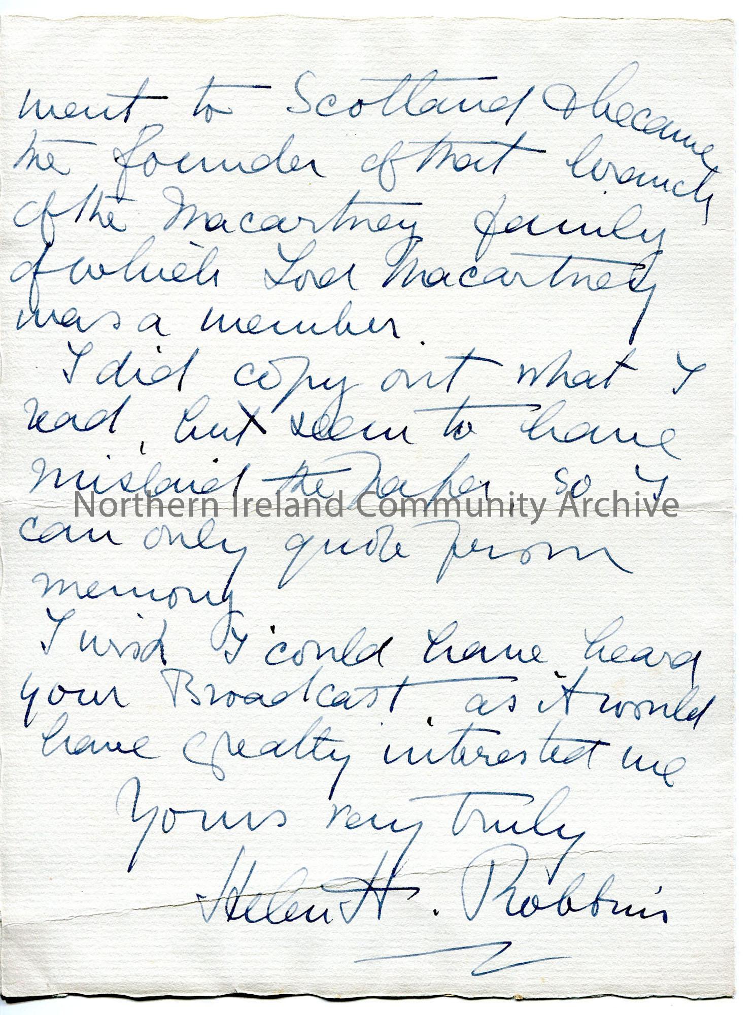 Handwritten letter folded in 2 and using all sides. Relates to McCartneys and Lissanoure Castle - origin of name and Irish and Scottish descent of the family