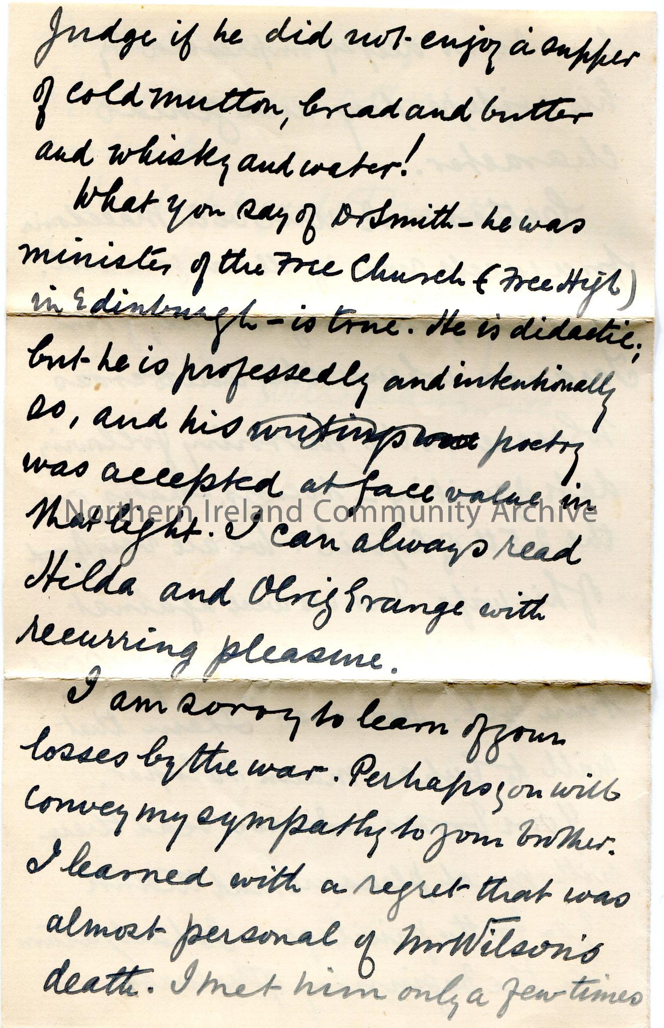 Handwritten letter (folded over and written on all sides) to 'My dear Henry'. Glad they were able to introduce Sam to Iuin? They sang Iuin's? verses to Sam whilst in Ireland. Writes of Iuin? sleeping in a cave for two nights. Mentions Dr Smith, minister of the Free Church. Sends sympathies to Sam for his losses during the war and to his brother. Writes of the death of Mr Wilson whom he had met. Writes of being against Catherwood's marriage. Enjoyed reading Sam's books.