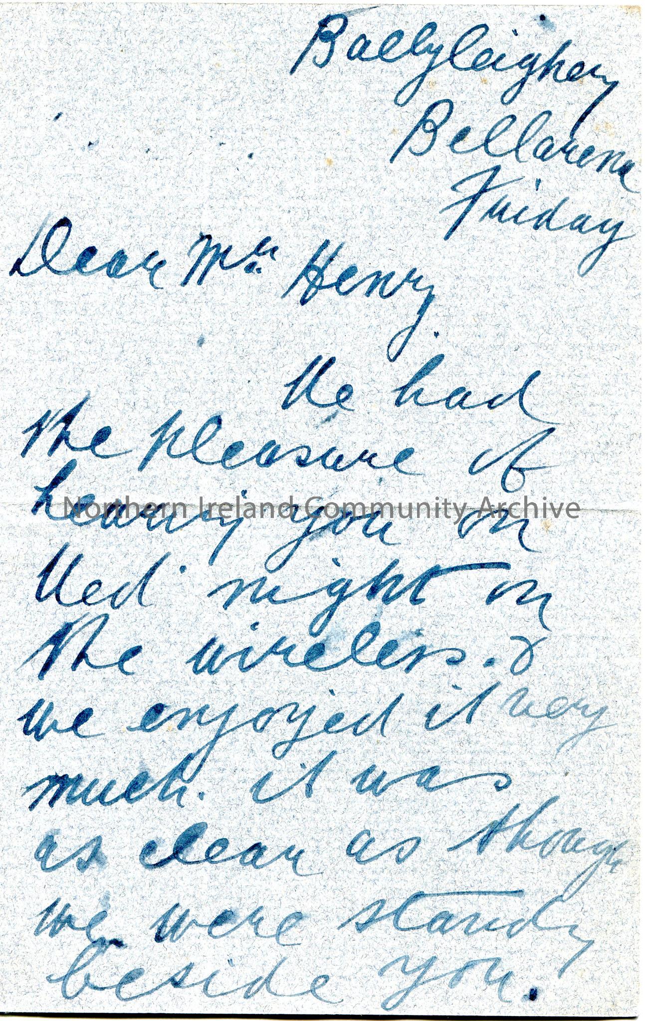 Handwritten letter (folded over written on two sides) to Sam Henry. Writing to say how much her and her husband enjoyed listening to a broadcast of Sam's. Her husband particularly liked the 'old style' songs.