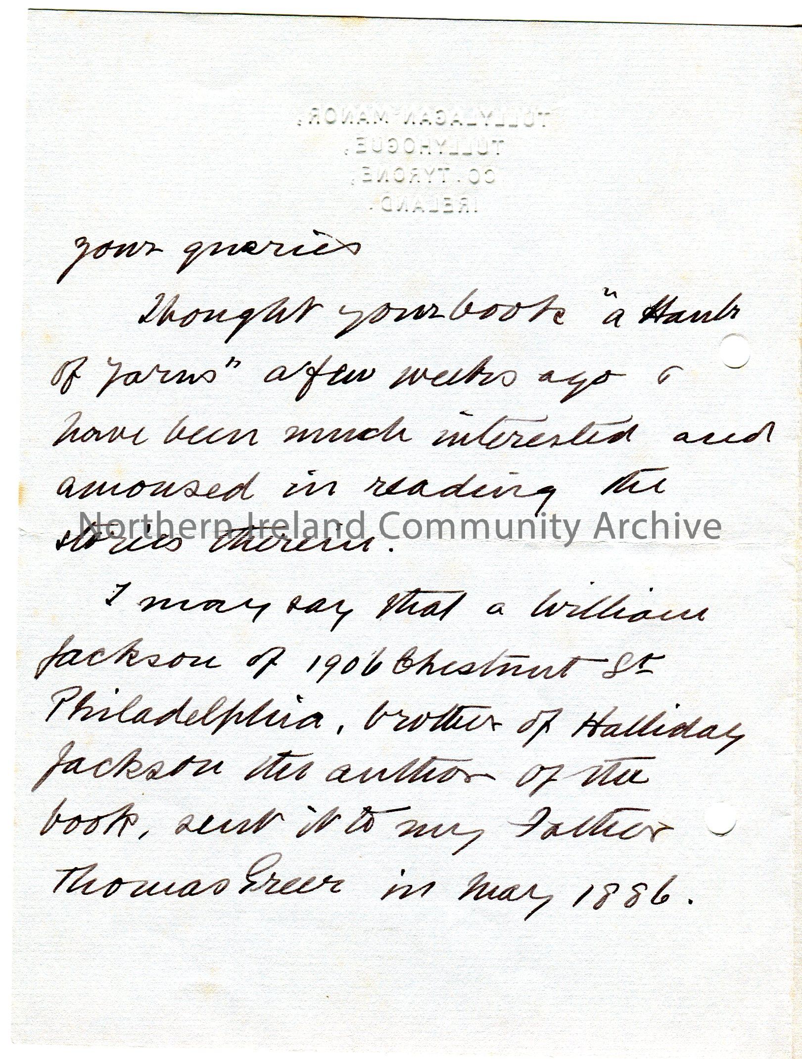 Handwritten letter (folded page on 3 sides) to Mr Henry. Apologises for not having any information on Sam’s query re Jackson family. Found Sam’s book,… – scan070b