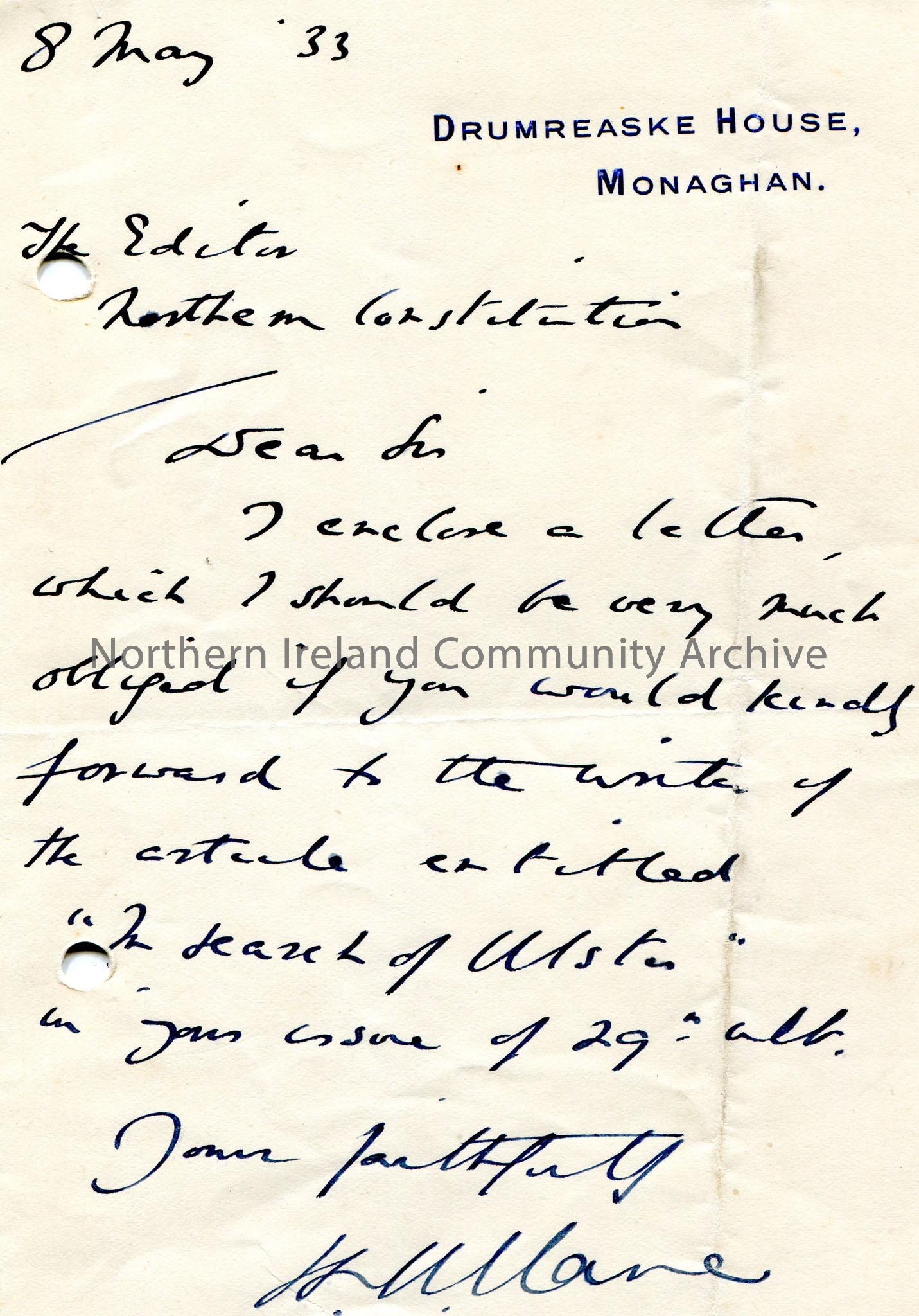 Handwritten letter, folded page, to the Editor of the Northern Constitution. Asks for the enclosed letter to be forwarded to the writer of an article titled 'In Search of Ulster'.