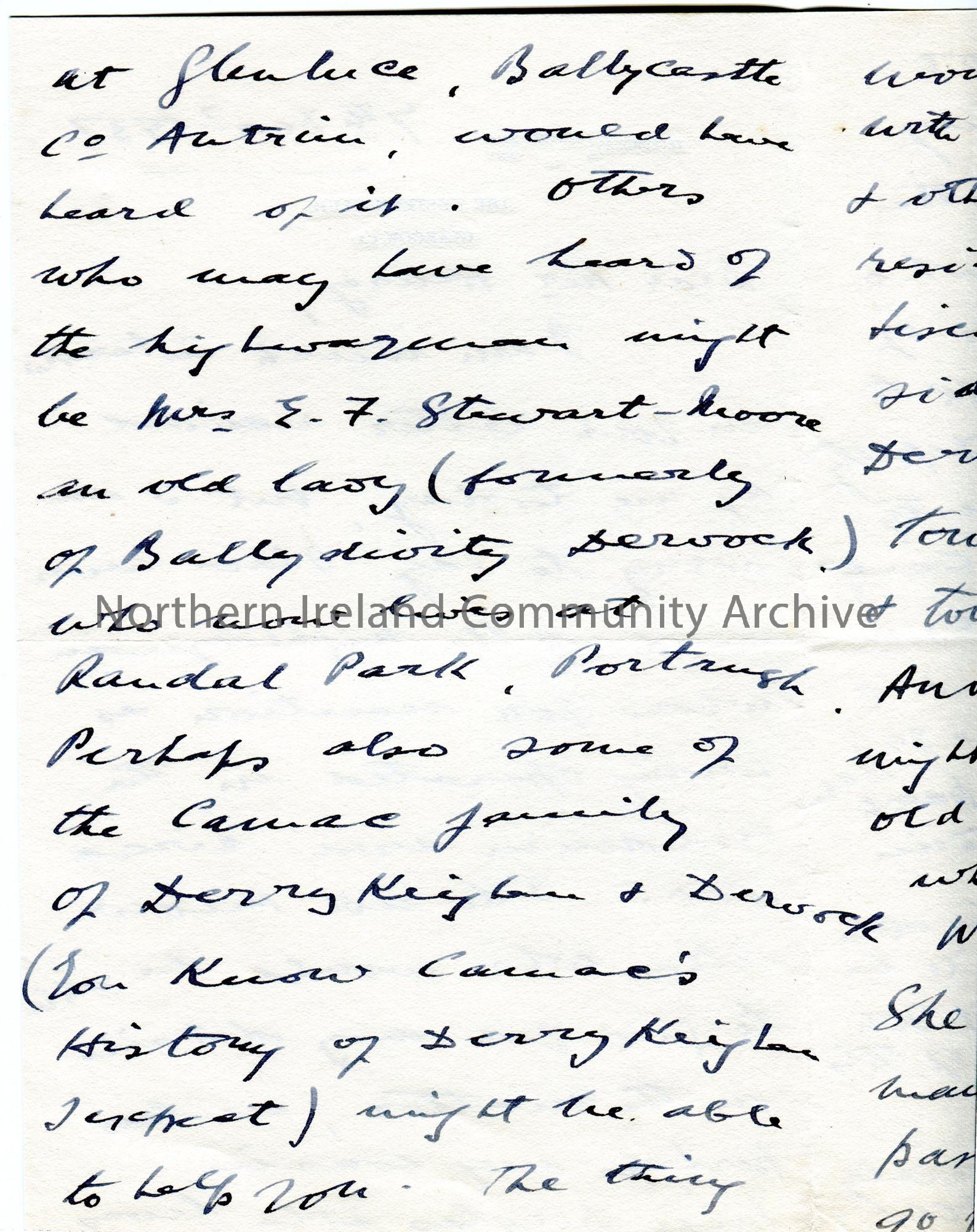 Handwritten letter (folded page written on 4 sides) to Sam Henry. Writing re Sam's enquiry of a Highwayman of Lisconnan c1800. Suggests that his sister, Miss Douglas of Ballycastle, may know as well as Mrs E F Stewart-Moore of Portrush. Also suggests visiting the oldest residents of the areas of Derrykeighan, Bushmills and Coleraine. Mentions a Mrs Ford-Hutchinson of Stranocum to visit. Gives details of his great great grandfather, Samuel Allen's career. He is very interested in Sam's enquiry and wishes to be told of any information Sam comes across as he is unable to help.