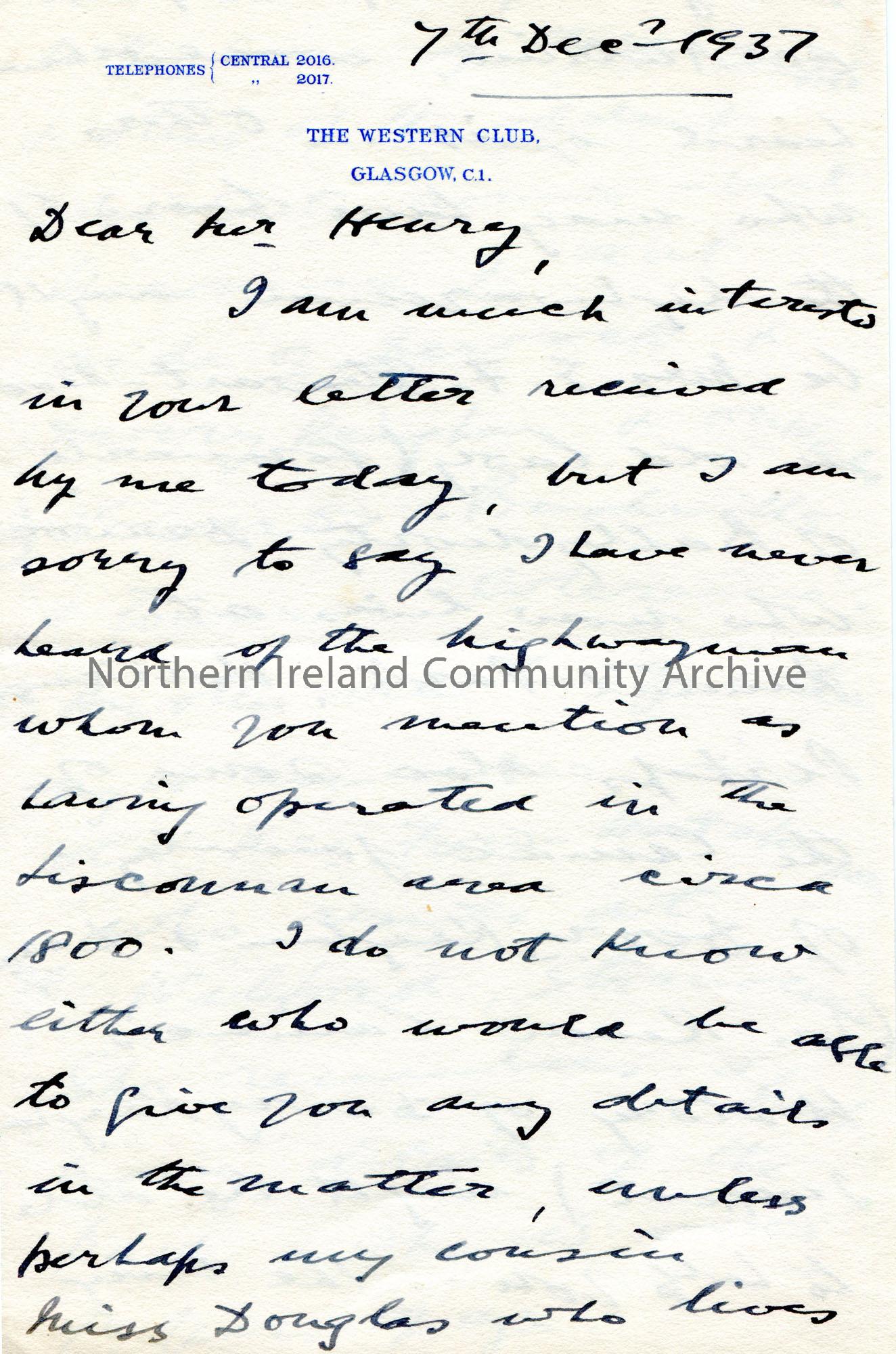 Handwritten letter (folded page written on 4 sides) to Sam Henry. Writing re Sam's enquiry of a Highwayman of Lisconnan c1800. Suggests that his sister, Miss Douglas of Ballycastle, may know as well as Mrs E F Stewart-Moore of Portrush. Also suggests visiting the oldest residents of the areas of Derrykeighan, Bushmills and Coleraine. Mentions a Mrs Ford-Hutchinson of Stranocum to visit. Gives details of his great great grandfather, Samuel Allen's career. He is very interested in Sam's enquiry and wishes to be told of any information Sam comes across as he is unable to help.