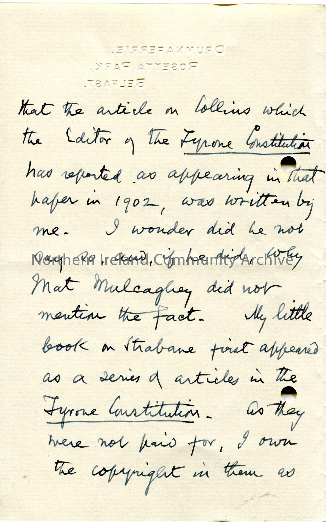 Handwritten letter (folded page written on four sides) to Sam Henry. Responding to Sam's search for a poem, 'Jim Campbell at Omagh Fair'. Writes that he has written a 'little book' on Strabane.