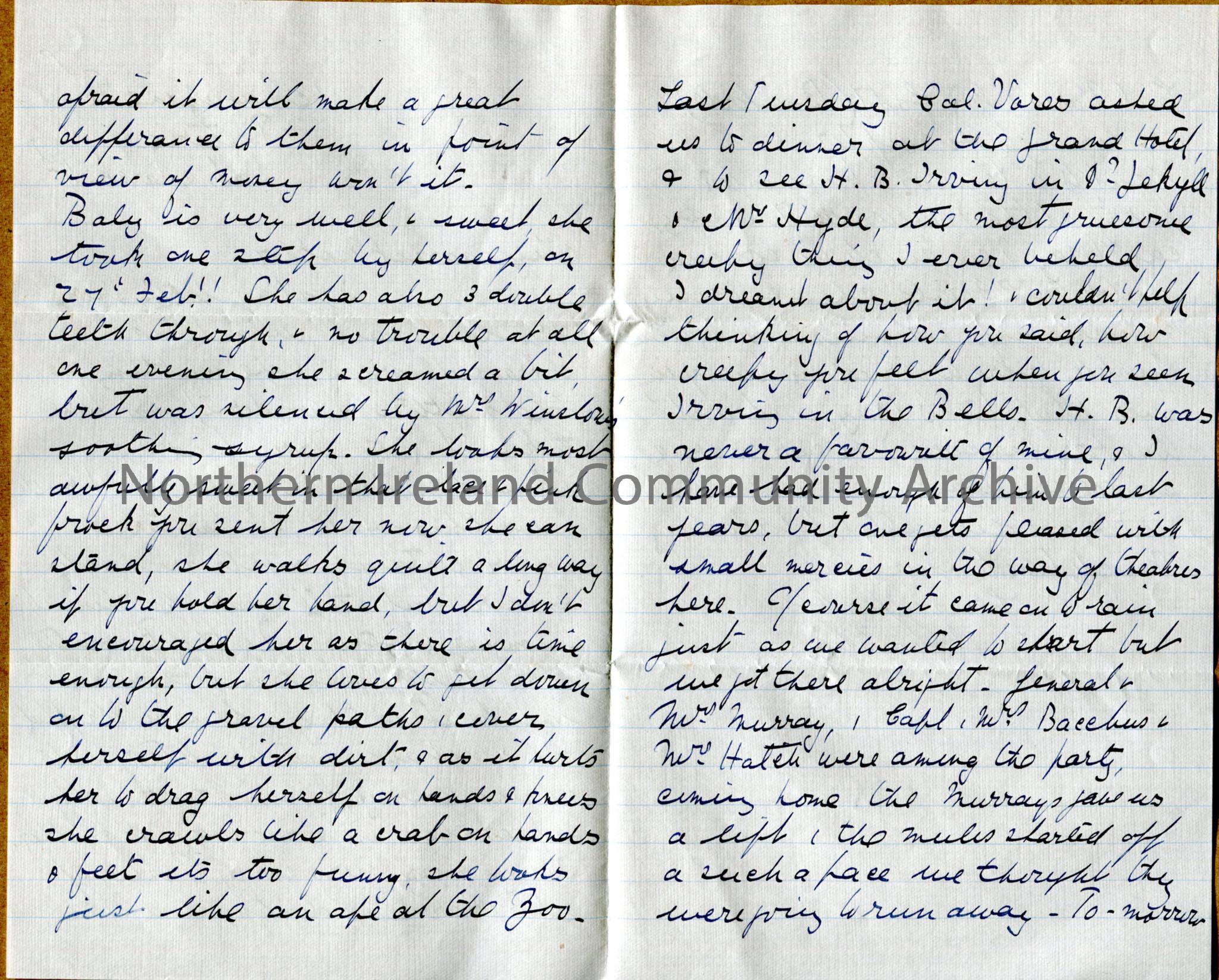 Handwritten letter from Dorothy to her mother, on 1 folded page, written on all four sides. Discusses "Baby", who crawls and has 3 double teeth now. Social engagements - went to theatre to see H B Irving in Dr Jekyll and Mr Hyde