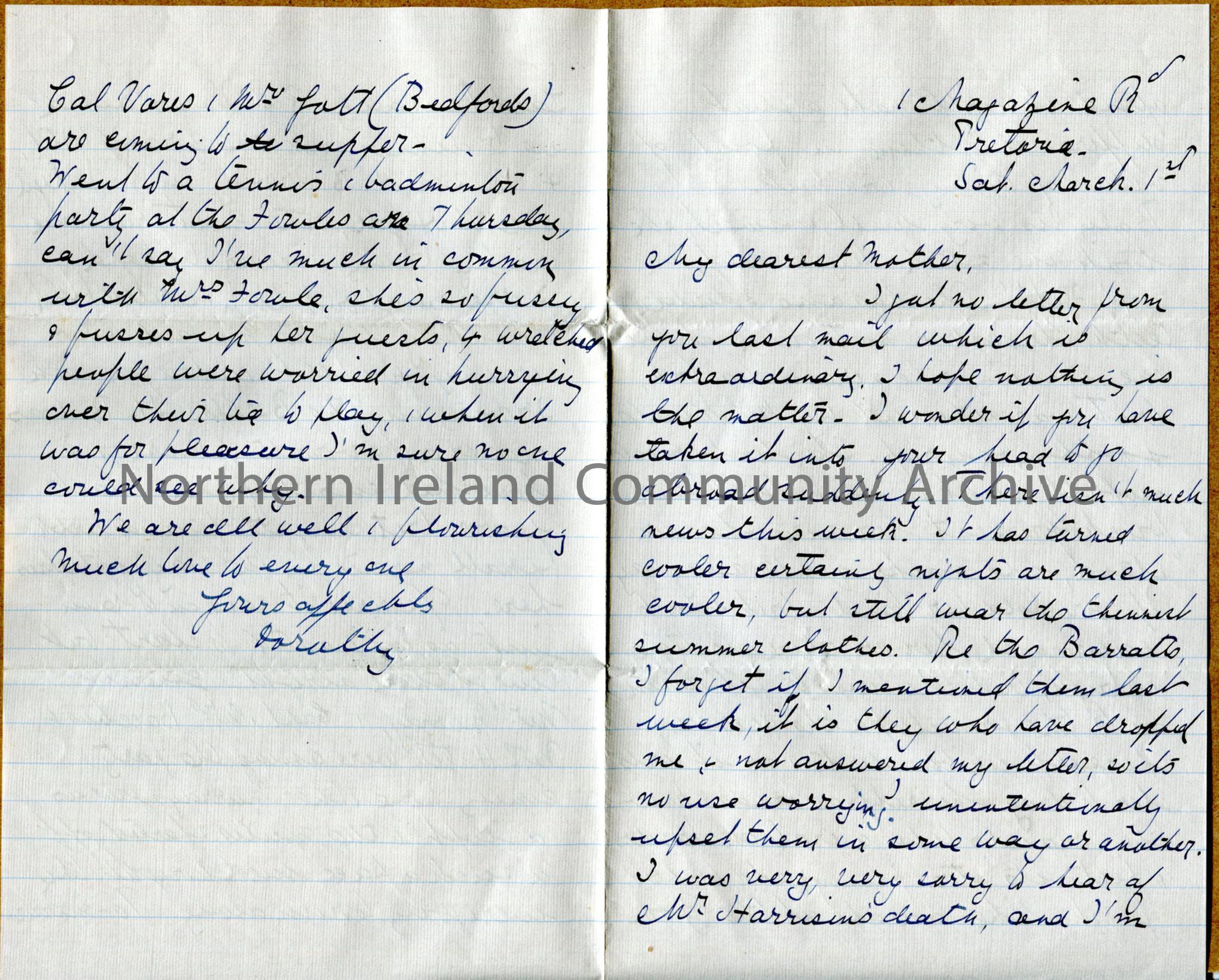Handwritten letter from Dorothy to her mother, on 1 folded page, written on all four sides. Discusses "Baby", who crawls and has 3 double teeth now. Social engagements - went to theatre to see H B Irving in Dr Jekyll and Mr Hyde