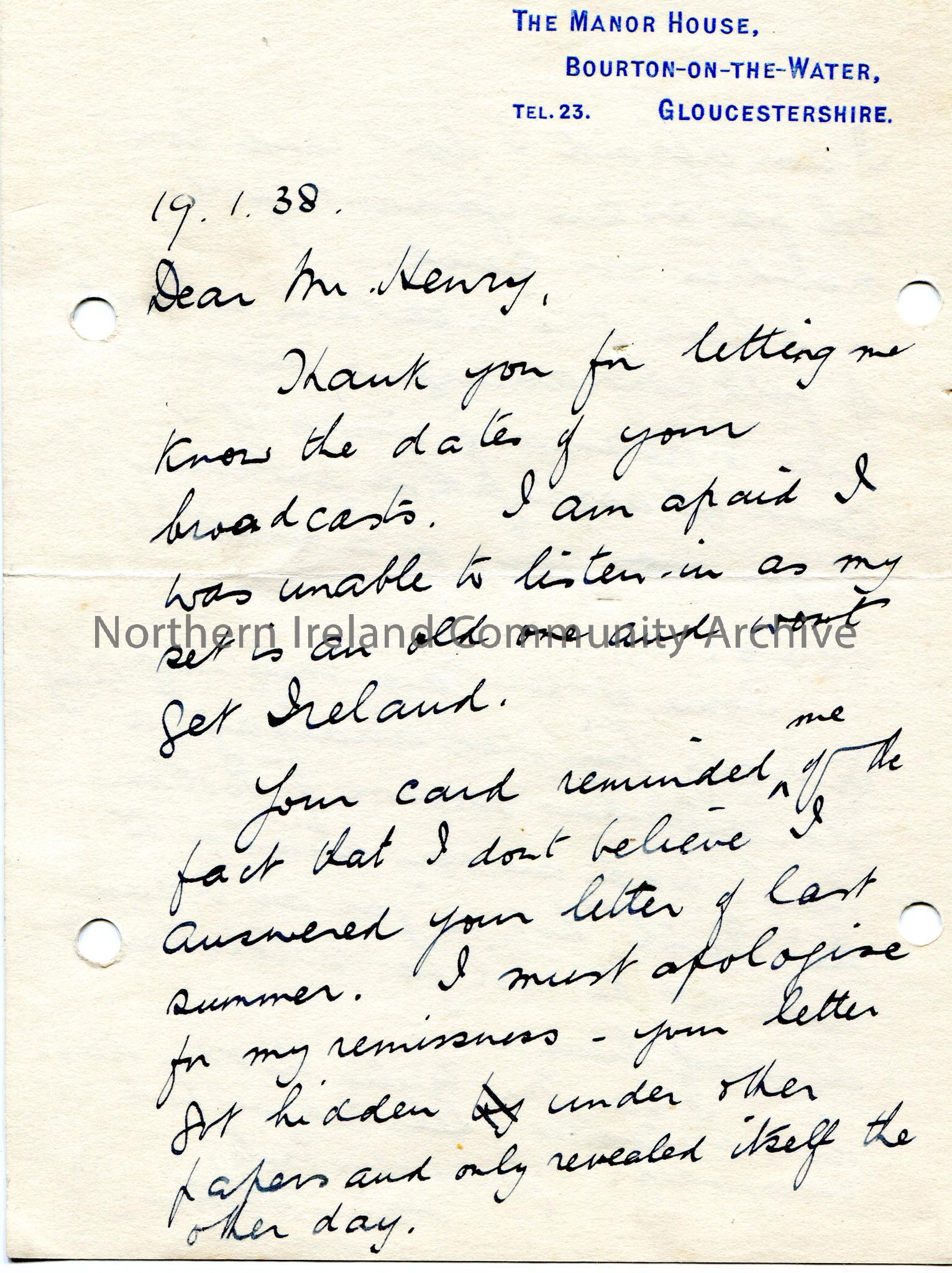 Handwritten letter from Harry [?] to Sam Henry. States that his radio is old and cannot receive broadcasts from Ireland. Apologises for not replying t…
